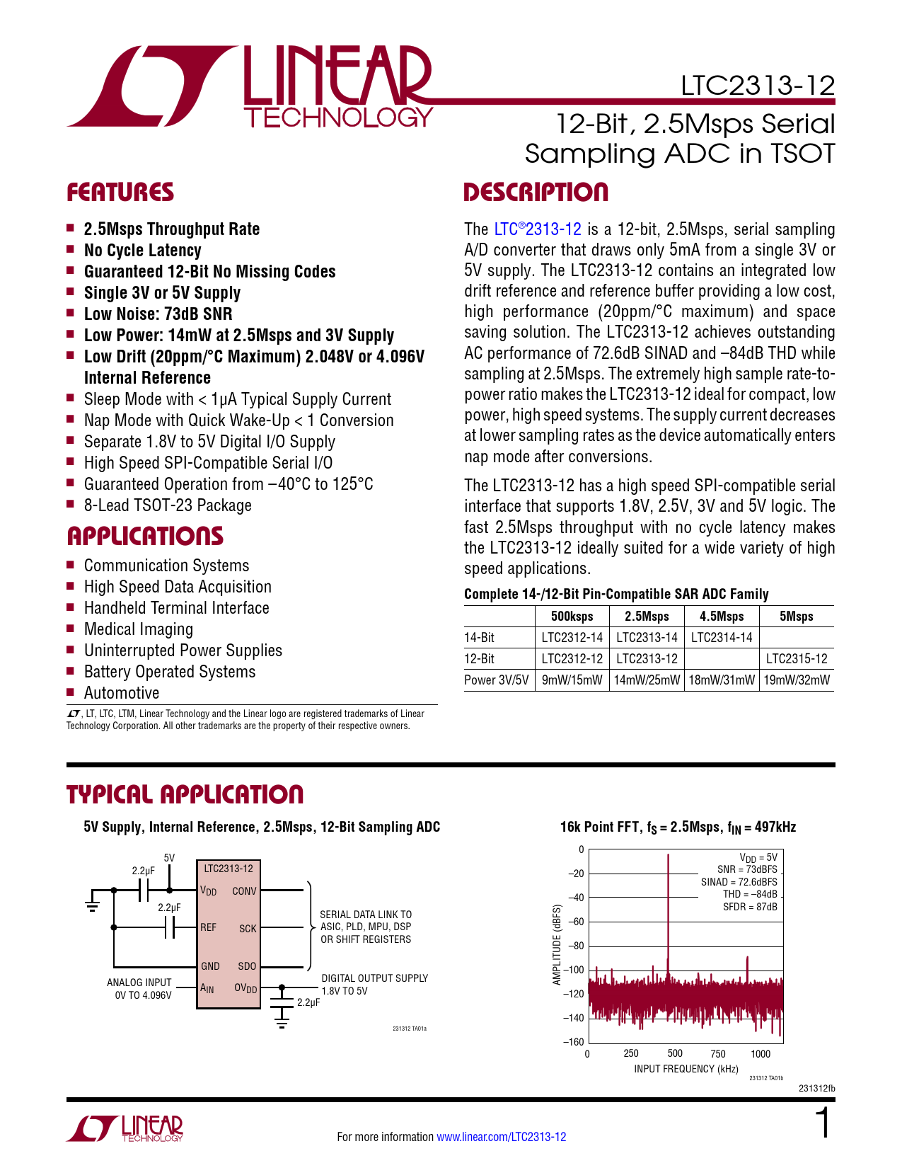 n Medical Imaging 14-Bit LTC2312-14 LTC2313-14 LTC2314-14 n Uninterrupted Power Supplies 12-Bit LTC2312-12 LTC2313-12 LTC2315-12 n Battery Operated Systems Power 3V/5V 9mW/15mW 14mW/25mW 18mW/31mW 19mW/32mW n Automotive L, LT, LTC, LTM, Linear Technology and the Linear logo are registered trademarks of Linear Technology Corporation. All other trademarks are the property of their respective owners.