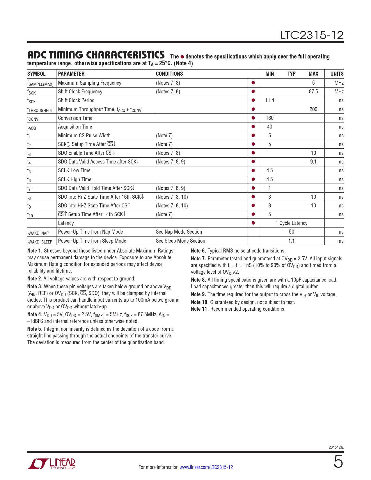 LTC2315-12 ADCTIMING CHARACTERISTICS The l denotes the specifications which apply over the full operatingtemperature range, otherwise specifications are at TA = 25°C. (Note 4) SYMBOLPARAMETERCONDITIONSMINTYPMAXUNITS fSAMPLE(MAX) Maximum Sampling Frequency (Notes 7, 8) l 5 MHz fSCK Shift Clock Frequency (Notes 7, 8) l 87.5 MHz tSCK Shift Clock Period l 11.4 ns tTHROUGHPUT Minimum Throughput Time, tACQ + tCONV l 200 ns tCONV Conversion Time l 160 ns tACQ Acquisition Time l 40 ns t1 Minimum CS Pulse Width (Note 7) l 5 ns ↔ t2 SCK Setup Time After CS↓ (Note 7) l 5 ns t3 SDO Enable Time After CS↓ (Notes 7, 8) l 10 ns t4 SDO Data Valid Access Time after SCK↓ (Notes 7, 8, 9) l 9.1 ns t5 SCLK Low Time l 4.5 ns t6 SCLK High Time l 4.5 ns t7 SDO Data Valid Hold Time After SCK↓ (Notes 7, 8, 9) l 1 ns t8 SDO into Hi-Z State Time After 16th SCK↓ (Notes 7, 8, 10) l 3 10 ns t9 SDO into Hi-Z State Time After CS↑ (Notes 7, 8, 10) l 3 10 ns t10 CS↑ Setup Time After 14th SCK↓ (Note 7) l 5 ns Latency l 1 Cycle Latency tWAKE_NAP Power-Up Time from Nap Mode See Nap Mode Section 50 ns tWAKE_SLEEP Power-Up Time from Sleep Mode See Sleep Mode Section 1.1 ms Note 1. Stresses beyond those listed under Absolute Maximum Ratings Note 6. Typical RMS noise at code transitions. may cause permanent damage to the device. Exposure to any Absolute Note 7. Parameter tested and guaranteed at OVDD = 2.5V. All input signals Maximum Rating condition for extended periods may affect device are specified with tr = tf = 1nS (10% to 90% of OVDD) and timed from a reliability and lifetime. voltage level of OVDD/2. Note 2 . All voltage values are with respect to ground. Note 8. All timing specifications given are with a 10pF capacitance load. Note 3. When these pin voltages are taken below ground or above VDD Load capacitances greater than this will require a digital buffer. (AIN, REF) or OVDD (SCK, CS, SDO) they will be clamped by internal Note 9. The time required for the output to cross the VIH or VIL voltage. diodes. This product can handle input currents up to 100mA below ground Note 10. Guaranteed by design, not subject to test. or above VDD or OVDD without latch-up. Note 11. Recommended operating conditions. Note 4. VDD = 5V, OVDD = 2.5V, fSMPL = 5MHz, fSCK = 87.5MHz, AIN = –1dBFS and internal reference unless otherwise noted. Note 5. Integral nonlinearity is defined as the deviation of a code from a straight line passing through the actual endpoints of the transfer curve. The deviation is measured from the center of the quantization band. 231512fa For more information www.linear.com/LTC2315-12 5