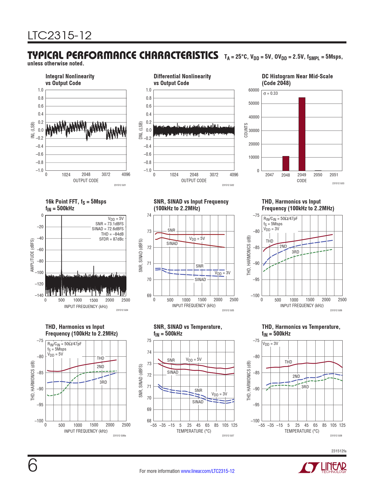 –75 75 –75 R V IN/CIN = 50Ω/47pF DD = 3V fS = 5Msps 74 –80 VDD = 5V –80 THD SNR VDD = 5V 73 THD 2ND –85 SINAD 72 –85 2ND 3RD 71 3RD –90 SNR –90 SNR, SINAD (dBFS) VDD = 3V 70 THD, HARMONICS (dB) SINAD THD, HARMONICS (dB) –95 –95 69 –100 68 –100 0 500 1000 1500 2000 2500 –55 –35 –15 5 25 45 65 85 105 125 –55 –35 –15 5 25 45 65 85 105 125 INPUT FREQUENCY (kHz) TEMPERATURE (°C) TEMPERATURE (°C) 231512 G06a 231512 G07 231512 G08 231512fa 6 For more information www.linear.com/LTC2315-12