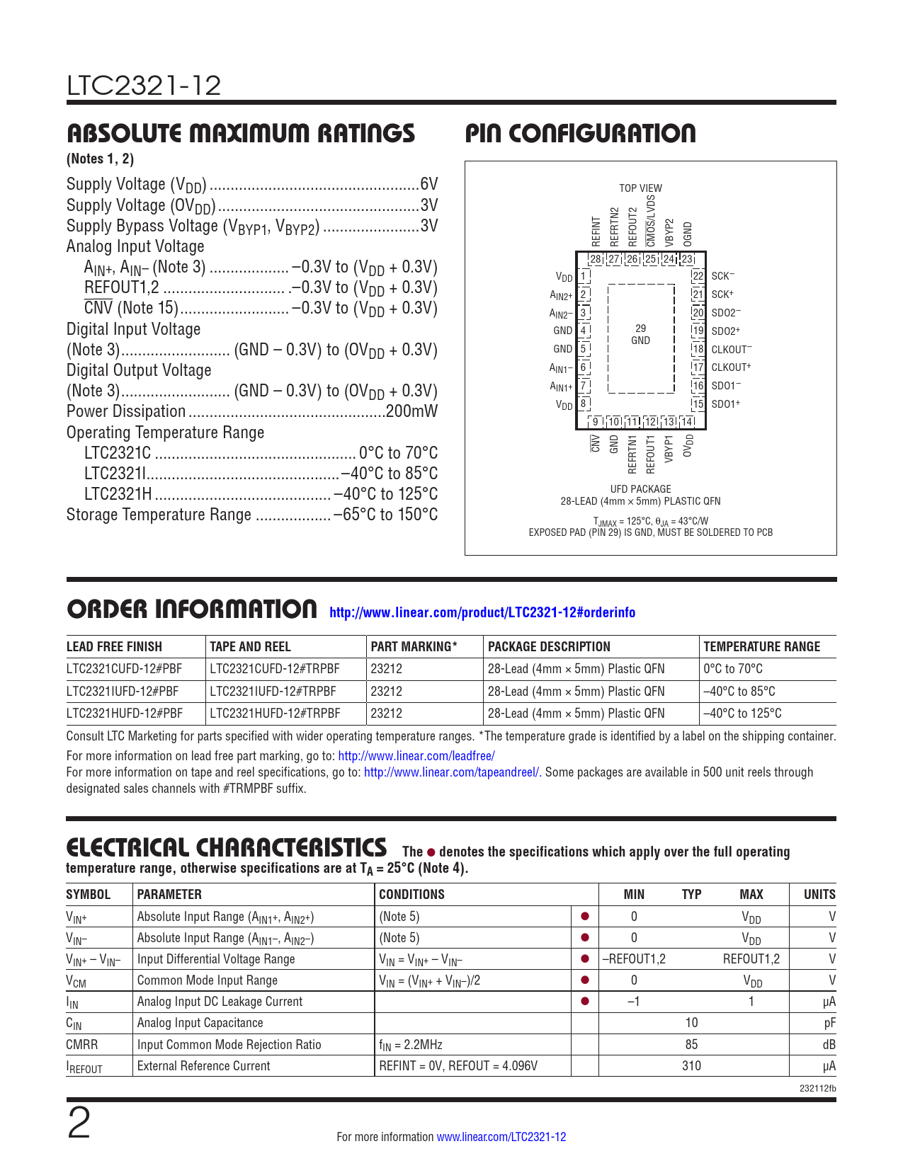 LTC2321-12 ABSOLUTE MAXIMUM RATINGSPIN CONFIGURATION(Notes 1, 2) Supply Voltage (VDD) ..6V TOP VIEW Supply Voltage (OVDD) ..3V Supply Bypass Voltage (V /LVDS BYP1, VBYP2) ...3V Analog Input Voltage REFINT REFRTN2 REFOUT2 CMOS VBYP2 OGND A 28 27 26 25 24 23 IN+, AIN– (Note 3) ... –0.3V to (VDD + 0.3V) VDD 1 22 REFOUT1,2 ... .–0.3V to (V SCK– DD + 0.3V) AIN2+ 2 21 SCK+ CNV (Note 15) .. –0.3V to (VDD + 0.3V) AIN2– 3 20 SDO2– Digital Input Voltage GND 4 29 19 SDO2+ (Note 3) .. (GND – 0.3V) to (OV GND DD + 0.3V) GND 5 18 CLKOUT– Digital Output Voltage AIN1– 6 17 CLKOUT+ (Note 3) .. (GND – 0.3V) to (OV A 7 16 SDO1– DD + 0.3V) IN1+ Power Dissipation ...200mW VDD 8 15 SDO1+ Operating Temperature Range 9 10 11 12 13 14 LTC2321C .. 0°C to 70°C DD CNV GND VBYP1 OV LTC2321I..–40°C to 85°C REFRTN1 REFOUT1 LTC2321H .. –40°C to 125°C UFD PACKAGE 28-LEAD (4mm × 5mm) PLASTIC QFN Storage Temperature Range .. –65°C to 150°C TJMAX = 125°C, θJA = 43°C/W EXPOSED PAD (PIN 29) IS GND, MUST BE SOLDERED TO PCB ORDER INFORMATION http://www.linear.com/product/LTC2321-12#orderinfoLEAD FREE FINISHTAPE AND REELPART MARKING*PACKAGE DESCRIPTIONTEMPERATURE RANGE LTC2321CUFD-12#PBF LTC2321CUFD-12#TRPBF 23212 28-Lead (4mm × 5mm) Plastic QFN 0°C to 70°C LTC2321IUFD-12#PBF LTC2321IUFD-12#TRPBF 23212 28-Lead (4mm × 5mm) Plastic QFN –40°C to 85°C LTC2321HUFD-12#PBF LTC2321HUFD-12#TRPBF 23212 28-Lead (4mm × 5mm) Plastic QFN –40°C to 125°C Consult LTC Marketing for parts specified with wider operating temperature ranges. *The temperature grade is identified by a label on the shipping container. For more information on lead free part marking, go to: http://www.linear.com/leadfree/ For more information on tape and reel specifications, go to: http://www.linear.com/tapeandreel/. Some packages are available in 500 unit reels through designated sales channels with #TRMPBF suffix. ELECTRICALCHARACTERISTICS The l denotes the specifications which apply over the full operatingtemperature range, otherwise specifications are at TA = 25°C (Note 4). SYMBOLPARAMETERCONDITIONSMINTYPMAXUNITS VIN+ Absolute Input Range (AIN1+, AIN2+) (Note 5) l 0 VDD V VIN– Absolute Input Range (AIN1–, AIN2–) (Note 5) l 0 VDD V VIN+ – VIN– Input Differential Voltage Range VIN = VIN+ – VIN– l –REFOUT1,2 REFOUT1,2 V VCM Common Mode Input Range VIN = (VIN+ + VIN–)/2 l 0 VDD V IIN Analog Input DC Leakage Current l –1 1 µA CIN Analog Input Capacitance 10 pF CMRR Input Common Mode Rejection Ratio fIN = 2.2MHz 85 dB IREFOUT External Reference Current REFINT = 0V, REFOUT = 4.096V 310 µA 232112fb 2 For more information www.linear.com/LTC2321-12 Document Outline Features Applications Description Typical Application Absolute Maximum Ratings Pin Configuration Order Information Electrical Characteristics Converter Characteristics Dynamic Accuracy Internal Reference Characteristics Digital Inputs And Digital Outputs Power Requirements ADC Timing Characteristics Typical Performance Characteristics Pin Functions Functional Block Diagram Timing Diagram Applications Information Package Description Related Parts