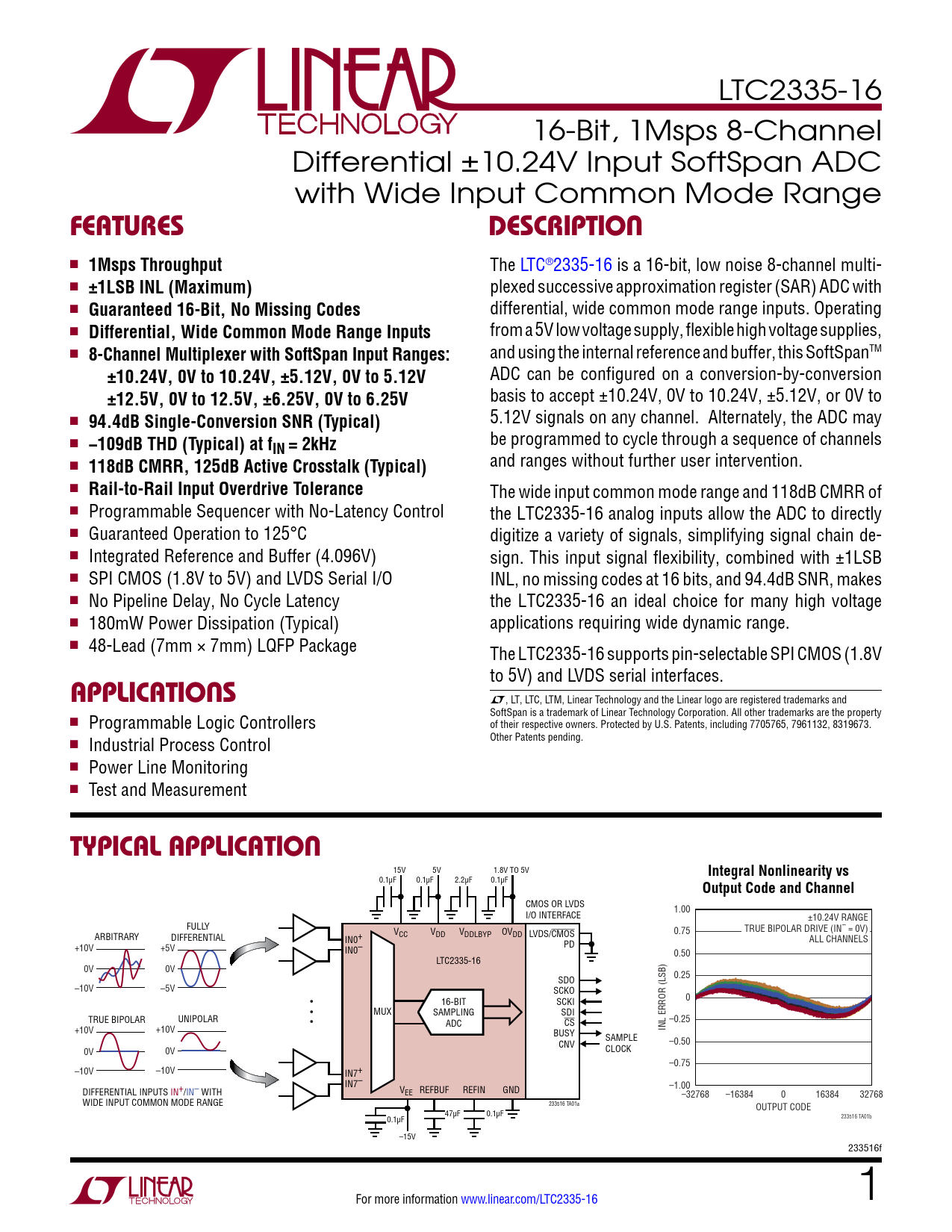 LTC2335-16 16-Bit, 1Msps 8-Channel Differential ±10.24V Input SoftSpan ADC with Wide Input Common Mode Range FeaTuresDescripTion n 1Msps Throughput The LTC®2335-16 is a 16-bit, low noise 8-channel multi- n ±1LSB INL (Maximum) plexed successive approximation register (SAR) ADC with n Guaranteed 16-Bit, No Missing Codes differential, wide common mode range inputs. Operating n Differential, Wide Common Mode Range Inputs from a 5V low voltage supply, flexible high voltage supplies, n 8-Channel Multiplexer with SoftSpan Input Ranges: and using the internal reference and buffer, this SoftSpanTM ±10.24V, 0V to 10.24V, ±5.12V, 0V to 5.12V ADC can be configured on a conversion-by-conversion ±12.5V, 0V to 12.5V, ±6.25V, 0V to 6.25V basis to accept ±10.24V, 0V to 10.24V, ±5.12V, or 0V to n 94.4dB Single-Conversion SNR (Typical) 5.12V signals on any channel. Alternately, the ADC may n be programmed to cycle through a sequence of channels −109dB THD (Typical) at fIN = 2kHz n and ranges without further user intervention. 118dB CMRR, 125dB Active Crosstalk (Typical) n Rail-to-Rail Input Overdrive Tolerance The wide input common mode range and 118dB CMRR of n Programmable Sequencer with No-Latency Control the LTC2335-16 analog inputs allow the ADC to directly n Guaranteed Operation to 125°C digitize a variety of signals, simplifying signal chain de- n Integrated Reference and Buffer (4.096V) sign. This input signal flexibility, combined with ±1LSB n SPI CMOS (1.8V to 5V) and LVDS Serial I/O INL, no missing codes at 16 bits, and 94.4dB SNR, makes n No Pipeline Delay, No Cycle Latency the LTC2335-16 an ideal choice for many high voltage n 180mW Power Dissipation (Typical) applications requiring wide dynamic range. n 48-Lead (7mm × 7mm) LQFP Package The LTC2335-16 supports pin-selectable SPI CMOS (1.8V to 5V) and LVDS serial interfaces. applicaTions L, LT, LTC, LTM, Linear Technology and the Linear logo are registered trademarks and SoftSpan is a trademark of Linear Technology Corporation. All other trademarks are the property n Programmable Logic Controllers of their respective owners. Protected by U.S. Patents, including 7705765, 7961132, 8319673. Other Patents pending. n Industrial Process Control n Power Line Monitoring n Test and Measurement Typical applicaTion 15V 5V 1.8V TO 5V Integral Nonlinearity vs 0.1µF 0.1µF 2.2µF 0.1µF Output Code and Channel CMOS OR LVDS 1.00 I/O INTERFACE ±10.24V RANGE FULLY V TRUE BIPOLAR DRIVE (IN– = 0V) CC VDD VDDLBYP OVDD 0.75 ARBITRARY LVDS/CMOS DIFFERENTIAL IN0+ ALL CHANNELS +10V PD +5V IN0– 0.50 LTC2335-16 0V 0V SDO 0.25 –10V –5V SCKO • • • 16-BIT SCKI 0 MUX SAMPLING SDI TRUE BIPOLAR UNIPOLAR ADC CS –0.25 +10V +10V INL ERROR (LSB) BUSY SAMPLE CNV –0.50 CLOCK 0V 0V –0.75 –10V –10V IN7+ IN7– –1.00 DIFFERENTIAL INPUTS IN+/IN– WITH VEE REFBUF REFIN GND –32768 –16384 0 16384 32768 WIDE INPUT COMMON MODE RANGE 233516 TA01a OUTPUT CODE 47µF 0.1µF 0.1µF 233516 TA01b –15V 233516f For more information www.linear.com/LTC2335-16 1 Document Outline Features Description Applications Typical Application Absolute Maximum Ratings Pin Configuration Order Information Electrical Characteristics Converter Characteristics Dynamic Accuracy Internal Reference Characteristics Reference Buffer Characteristics Digital Inputs and Digital Outputs Power Requirements ADC Timing Characteristics Typical Performance Characteristics Pin Functions Configuration Tables Functional Block Diagram Timing Diagram Applications Information Board Layout Package Description Typical Application Related Parts