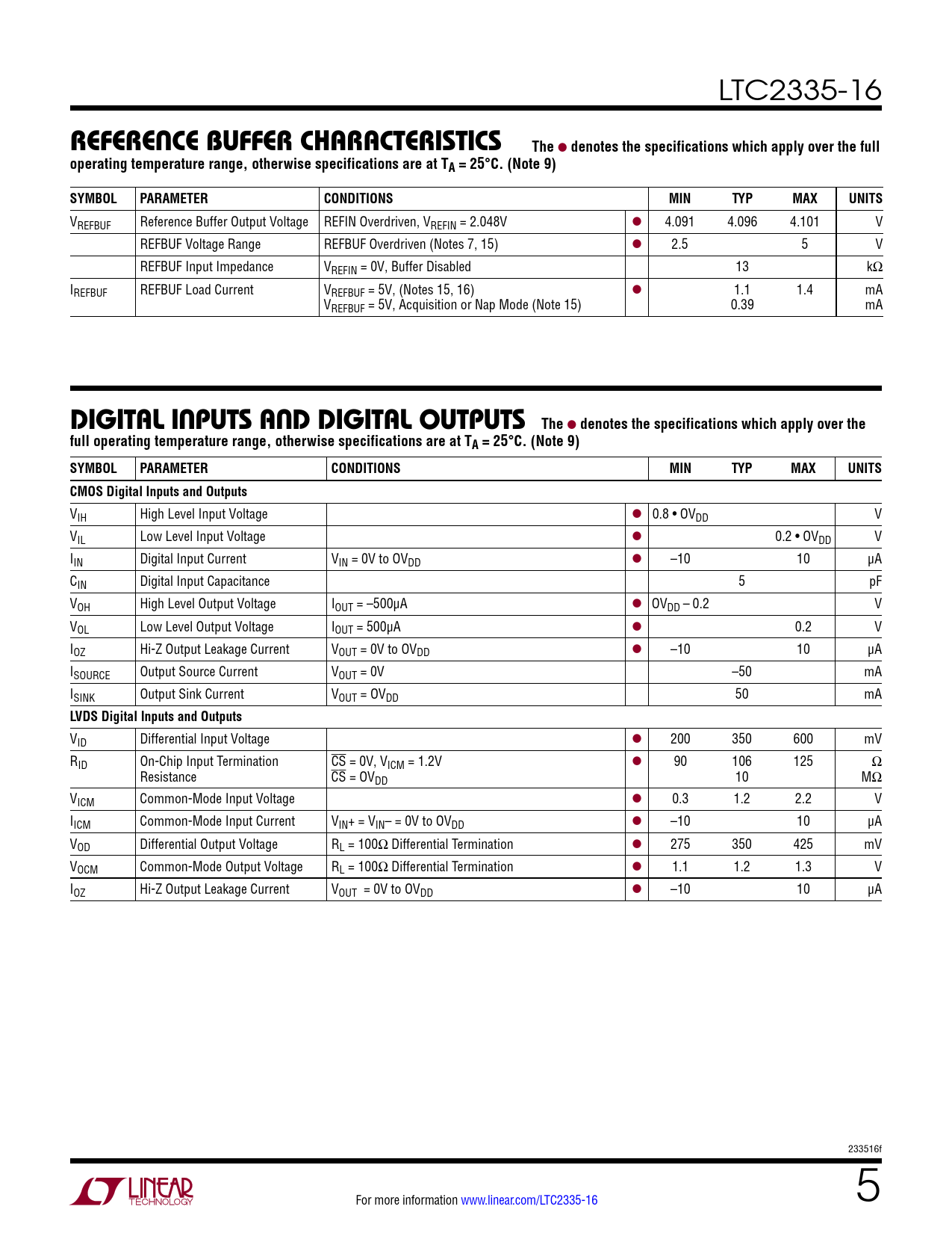 LTC2335-16 reFerence buFFer characTerisTicsThe l denotes the specifications which apply over the fulloperating temperature range, otherwise specifications are at TA = 25°C. (Note 9)SYMBOLPARAMETERCONDITIONSMINTYPMAXUNITS VREFBUF Reference Buffer Output Voltage REFIN Overdriven, VREFIN = 2.048V l 4.091 4.096 4.101 V REFBUF Voltage Range REFBUF Overdriven (Notes 7, 15) l 2.5 5 V REFBUF Input Impedance VREFIN = 0V, Buffer Disabled 13 kΩ IREFBUF REFBUF Load Current VREFBUF = 5V, (Notes 15, 16) l 1.1 1.4 mA VREFBUF = 5V, Acquisition or Nap Mode (Note 15) 0.39 mA DigiTal inpuTs anD DigiTal ouTpuTs The l denotes the specifications which apply over thefull operating temperature range, otherwise specifications are at TA = 25°C. (Note 9) SYMBOLPARAMETERCONDITIONSMINTYPMAXUNITSCMOS Digital Inputs and Outputs VIH High Level Input Voltage l 0.8 • OVDD V VIL Low Level Input Voltage l 0.2 • OVDD V IIN Digital Input Current VIN = 0V to OVDD l –10 10 μA CIN Digital Input Capacitance 5 pF VOH High Level Output Voltage IOUT = –500μA l OVDD – 0.2 V VOL Low Level Output Voltage IOUT = 500μA l 0.2 V IOZ Hi-Z Output Leakage Current VOUT = 0V to OVDD l –10 10 μA ISOURCE Output Source Current VOUT = 0V –50 mA ISINK Output Sink Current VOUT = OVDD 50 mA LVDS Digital Inputs and Outputs VID Differential Input Voltage l 200 350 600 mV RID On-Chip Input Termination CS = 0V, VICM = 1.2V l 90 106 125 Ω Resistance CS = OVDD 10 MΩ VICM Common-Mode Input Voltage l 0.3 1.2 2.2 V IICM Common-Mode Input Current VIN+ = VIN– = 0V to OVDD l –10 10 μA VOD Differential Output Voltage RL = 100Ω Differential Termination l 275 350 425 mV VOCM Common-Mode Output Voltage RL = 100Ω Differential Termination l 1.1 1.2 1.3 V IOZ Hi-Z Output Leakage Current VOUT = 0V to OVDD l –10 10 μA 233516f For more information www.linear.com/LTC2335-16 5 Document Outline Features Description Applications Typical Application Absolute Maximum Ratings Pin Configuration Order Information Electrical Characteristics Converter Characteristics Dynamic Accuracy Internal Reference Characteristics Reference Buffer Characteristics Digital Inputs and Digital Outputs Power Requirements ADC Timing Characteristics Typical Performance Characteristics Pin Functions Configuration Tables Functional Block Diagram Timing Diagram Applications Information Board Layout Package Description Typical Application Related Parts