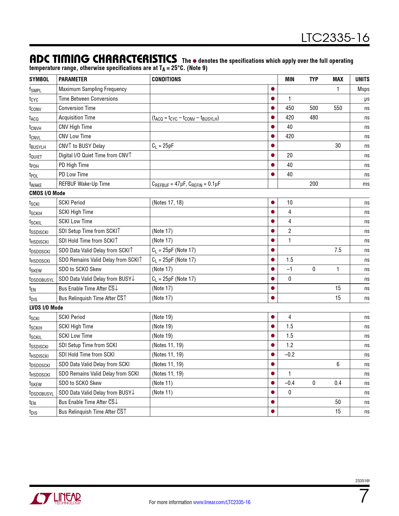LTC2335-16 aDc TiMing characTerisTics The l denotes the specifications which apply over the full operatingtemperature range, otherwise specifications are at TA = 25°C. (Note 9) SYMBOLPARAMETERCONDITIONSMINTYPMAXUNITS fSMPL Maximum Sampling Frequency l 1 Msps tCYC Time Between Conversions l 1 μs tCONV Conversion Time l 450 500 550 ns tACQ Acquisition Time (tACQ = tCYC – tCONV – tBUSYLH) l 420 480 ns tCNVH CNV High Time l 40 ns tCNVL CNV Low Time l 420 ns tBUSYLH CNV↑ to BUSY Delay CL = 25pF l 30 ns tQUIET Digital I/O Quiet Time from CNV↑ l 20 ns tPDH PD High Time l 40 ns tPDL PD Low Time l 40 ns tWAKE REFBUF Wake-Up Time CREFBUF = 47μF, CREFIN = 0.1μF 200 ms CMOS I/O Mode tSCKI SCKI Period (Notes 17, 18) l 10 ns tSCKIH SCKI High Time l 4 ns tSCKIL SCKI Low Time l 4 ns tSSDISCKI SDI Setup Time from SCKI↑ (Note 17) l 2 ns tHSDISCKI SDI Hold Time from SCKI↑ (Note 17) l 1 ns tDSDOSCKI SDO Data Valid Delay from SCKI↑ CL = 25pF (Note 17) l 7.5 ns tHSDOSCKI SDO Remains Valid Delay from SCKI↑ CL = 25pF (Note 17) l 1.5 ns tSKEW SDO to SCKO Skew (Note 17) l –1 0 1 ns tDSDOBUSYL SDO Data Valid Delay from BUSY↓ CL = 25pF (Note 17) l 0 ns tEN Bus Enable Time After CS↓ (Note 17) l 15 ns tDIS Bus Relinquish Time After CS↑ (Note 17) l 15 ns LVDS I/O Mode tSCKI SCKI Period (Note 19) l 4 ns tSCKIH SCKI High Time (Note 19) l 1.5 ns tSCKIL SCKI Low Time (Note 19) l 1.5 ns tSSDISCKI SDI Setup Time from SCKI (Notes 11, 19) l 1.2 ns tHSDISCKI SDI Hold Time from SCKI (Notes 11, 19) l –0.2 ns tDSDOSCKI SDO Data Valid Delay from SCKI (Notes 11, 19) l 6 ns tHSDOSCKI SDO Remains Valid Delay from SCKI (Notes 11, 19) l 1 ns tSKEW SDO to SCKO Skew (Note 11) l –0.4 0 0.4 ns tDSDOBUSYL SDO Data Valid Delay from BUSY↓ (Note 11) l 0 ns tEN Bus Enable Time After CS↓ l 50 ns tDIS Bus Relinquish Time After CS↑ l 15 ns 233516f For more information www.linear.com/LTC2335-16 7 Document Outline Features Description Applications Typical Application Absolute Maximum Ratings Pin Configuration Order Information Electrical Characteristics Converter Characteristics Dynamic Accuracy Internal Reference Characteristics Reference Buffer Characteristics Digital Inputs and Digital Outputs Power Requirements ADC Timing Characteristics Typical Performance Characteristics Pin Functions Configuration Tables Functional Block Diagram Timing Diagram Applications Information Board Layout Package Description Typical Application Related Parts