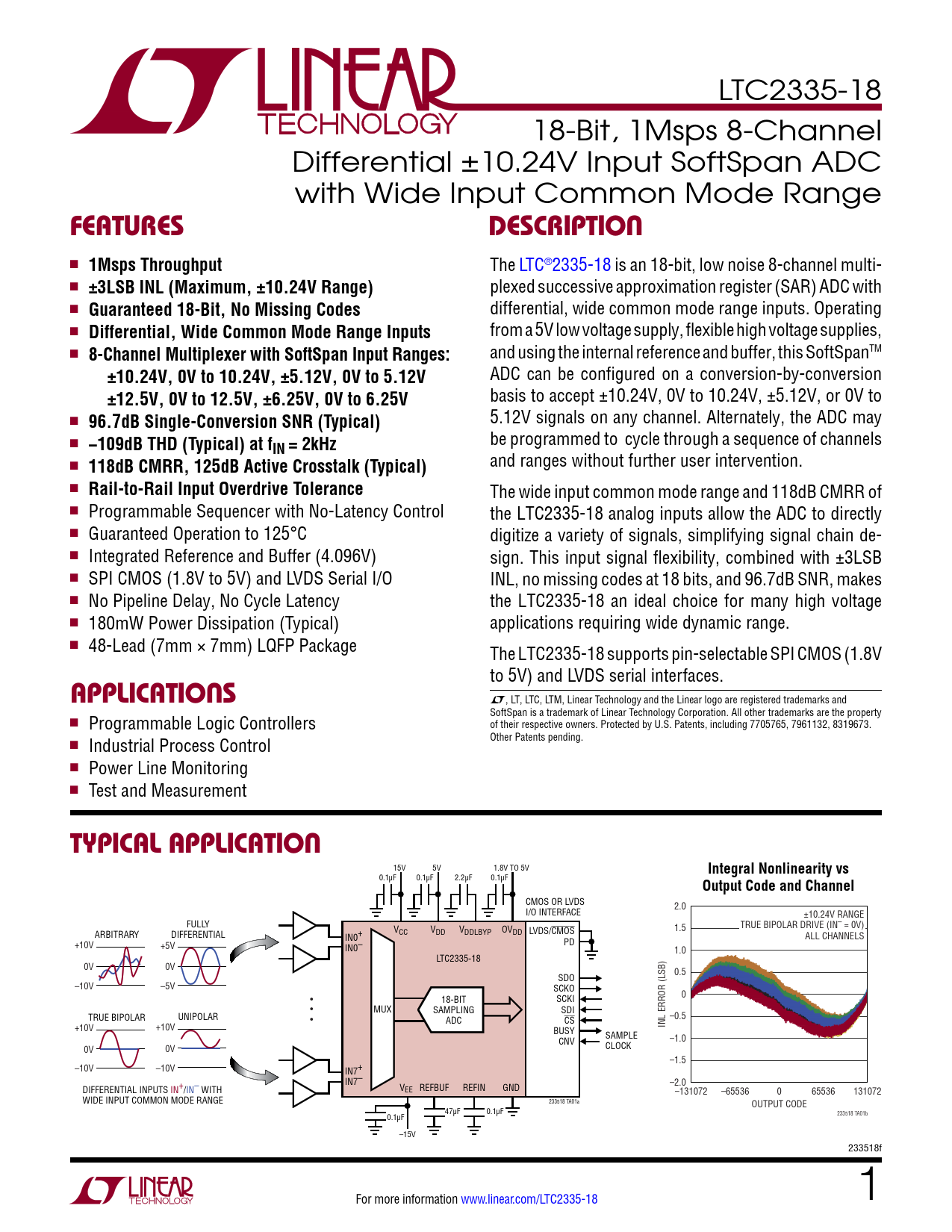 L, LT, LTC, LTM, Linear Technology and the Linear logo are registered trademarks and SoftSpan is a trademark of Linear Technology Corporation. All other trademarks are the property n Programmable Logic Controllers of their respective owners. Protected by U.S. Patents, including 7705765, 7961132, 8319673. Other Patents pending. n Industrial Process Control n Power Line Monitoring n Test and Measurement