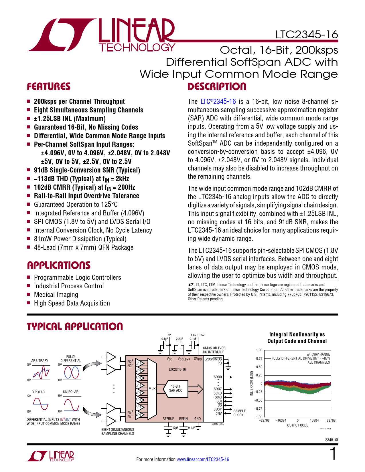 lanes of data output may be employed in CMOS mode, n allowing the user to optimize bus width and throughput. Programmable Logic Controllers L n , LT, LTC, LTM, Linear Technology and the Linear logo are registered trademarks and Industrial Process Control SoftSpan is a trademark of Linear Technology Corporation. All other trademarks are the property n of their respective owners. Protected by U.S. Patents, including 7705765, 7961132, 8319673. Medical Imaging Other Patents pending. n High Speed Data Acquisition