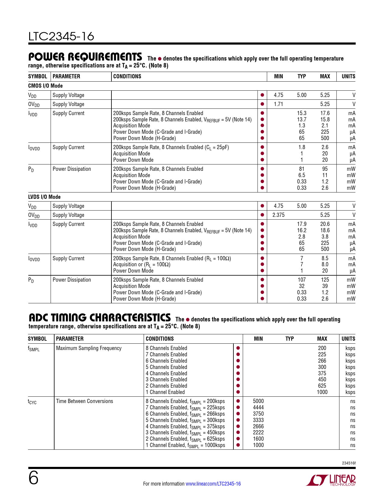 fSMPL Maximum Sampling Frequency 8 Channels Enabled l 200 ksps 7 Channels Enabled l 225 ksps 6 Channels Enabled l 266 ksps 5 Channels Enabled l 300 ksps 4 Channels Enabled l 375 ksps 3 Channels Enabled l 450 ksps 2 Channels Enabled l 625 ksps 1 Channel Enabled l 1000 ksps tCYC Time Between Conversions 8 Channels Enabled, fSMPL = 200ksps l 5000 ns 7 Channels Enabled, fSMPL = 225ksps l 4444 ns 6 Channels Enabled, fSMPL = 266ksps l 3750 ns 5 Channels Enabled, fSMPL = 300ksps l 3333 ns 4 Channels Enabled, fSMPL = 375ksps l 2666 ns 3 Channels Enabled, fSMPL = 450ksps l 2222 ns 2 Channels Enabled, fSMPL = 625ksps l 1600 ns 1 Channel Enabled, fSMPL = 1000ksps l 1000 ns 234516f 6 For more information www.linear.com/LTC2345-16 Document Outline Features Description Applications Typical Application Absolute Maximum Ratings Pin Configuration Order Information Electrical Characteristics Converter Characteristics Dynamic Accuracy Internal Reference Characteristics Reference Buffer Characteristics Digital Inputs and Digital Outputs Power Requirements ADC Timing Characteristics Typical Performance Characteristics Pin Functions Configuration Tables Functional Block Diagram Timing Diagram Applications Information Board Layout Package Description Typical Application Related Parts