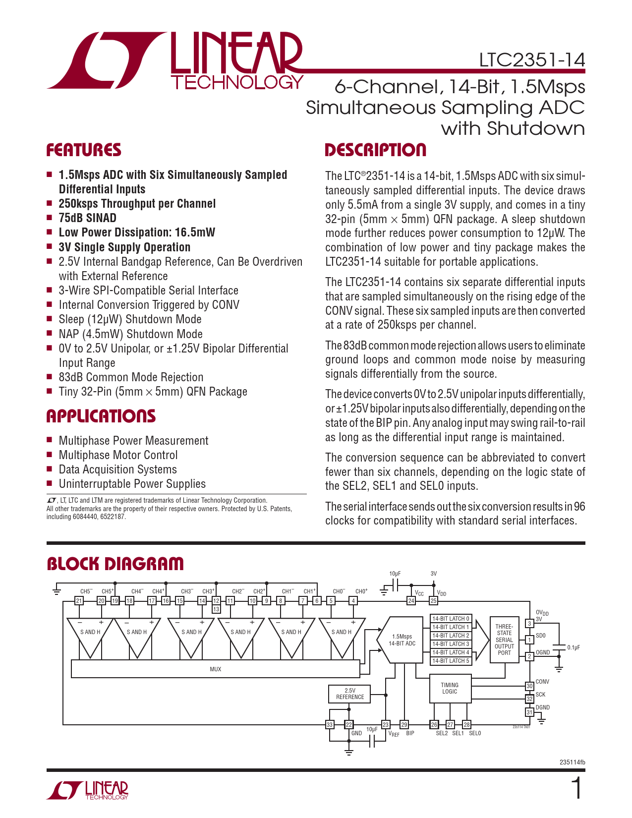 LTC2351-14 6-Channel, 14-Bit, 1.5Msps Simultaneous Sampling ADC with Shutdown FEATURESDESCRIPTION n 1.5Msps ADC with Six Simultaneously Sampled The LTC®2351-14 is a 14-bit, 1.5Msps ADC with six simul- Differential Inputs taneously sampled differential inputs. The device draws n 250ksps Throughput per Channel only 5.5mA from a single 3V supply, and comes in a tiny n 75dB SINAD 32-pin (5mm × 5mm) QFN package. A sleep shutdown n Low Power Dissipation: 16.5mW mode further reduces power consumption to 12μW. The n 3V Single Supply Operation combination of low power and tiny package makes the n 2.5V Internal Bandgap Reference, Can Be Overdriven LTC2351-14 suitable for portable applications. with External Reference The LTC2351-14 contains six separate differential inputs n 3-Wire SPI-Compatible Serial Interface that are sampled simultaneously on the rising edge of the n Internal Conversion Triggered by CONV CONV signal. These six sampled inputs are then converted n Sleep (12μW) Shutdown Mode at a rate of 250ksps per channel. n NAP (4.5mW) Shutdown Mode n The 83dB common mode rejection allows users to eliminate 0V to 2.5V Unipolar, or ±1.25V Bipolar Differential ground loops and common mode noise by measuring Input Range n signals differentially from the source. 83dB Common Mode Rejection n Tiny 32-Pin (5mm × 5mm) QFN Package The device converts 0V to 2.5V unipolar inputs differentially, APPLICATIONS or ±1.25V bipolar inputs also differentially, depending on the state of the BIP pin. Any analog input may swing rail-to-rail n as long as the differential input range is maintained. Multiphase Power Measurement n Multiphase Motor Control The conversion sequence can be abbreviated to convert n Data Acquisition Systems fewer than six channels, depending on the logic state of n Uninterruptable Power Supplies the SEL2, SEL1 and SEL0 inputs. L, LT, LTC and LTM are registered trademarks of Linear Technology Corporation. All other trademarks are the property of their respective owners. Protected by U.S. Patents, The serial interface sends out the six conversion results in 96 including 6084440, 6522187. clocks for compatibility with standard serial interfaces. BLOCK DIAGRAM 10μF 3V CH4– CH4+ CH5– CH5+ CH2– CH2+ CH3– CH3+ CH0– CH0+ CH1– CH1+ VCC VDD 21 20 19 18 17 16 15 14 12 11 10 9 8 7 6 5 4 24 25 13 OVDD + + + + + + 14-BIT LATCH 0 – 3V – – – – – 3 14-BIT LATCH 1 THREE- S AND H S AND H S AND H S AND H S AND H S AND H STATE 1.5Msps 14-BIT LATCH 2 SD0 SERIAL 1 14-BIT ADC 14-BIT LATCH 3 OUTPUT 0.1μF 14-BIT LATCH 4 PORT OGND 2 14-BIT LATCH 5 MUX CONV TIMING 30 2.5V LOGIC REFERENCE SCK 32 DGND 31 33 22 23 29 26 27 28 10μF 235114 TA01 GND VREF BIP SEL2 SEL1 SEL0 235114fb 1