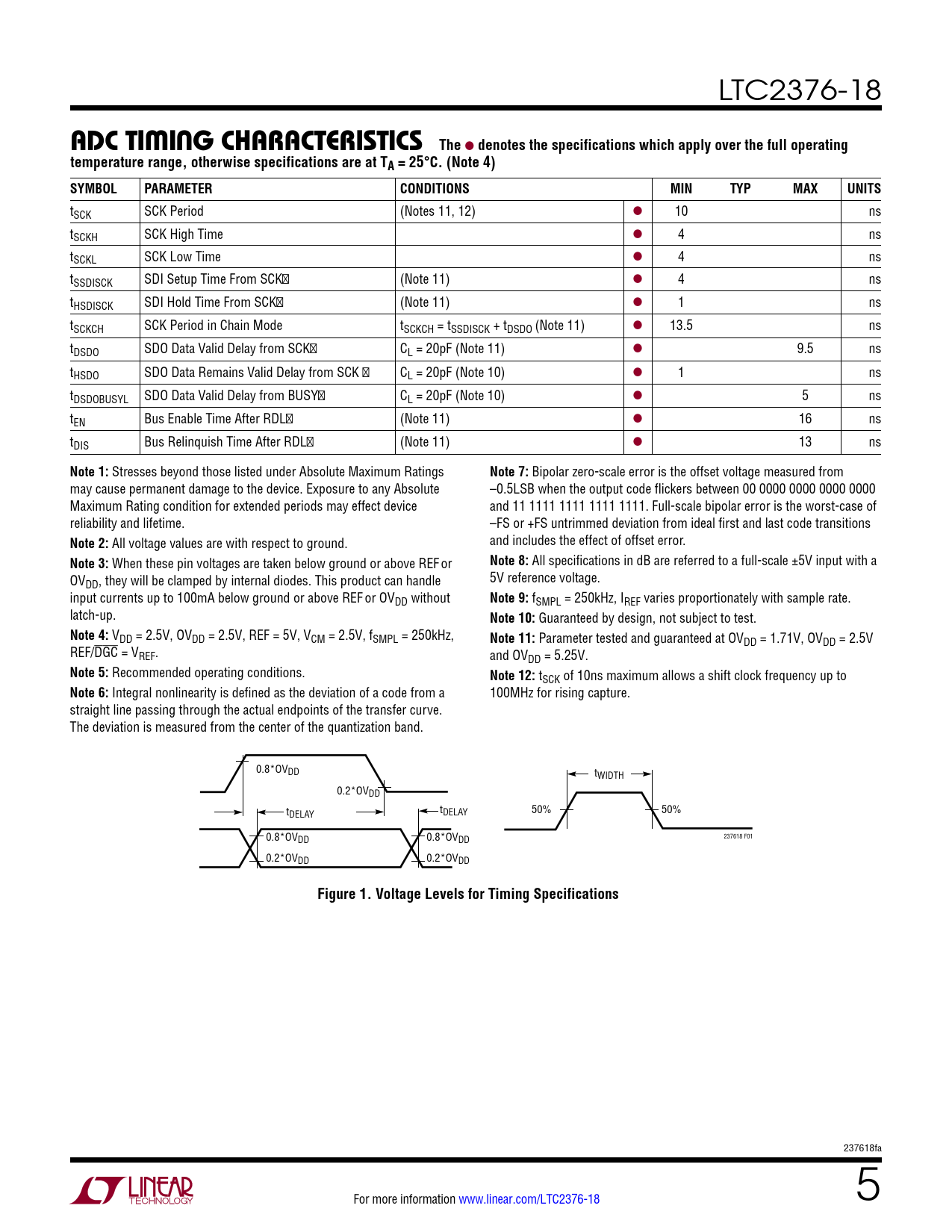 LTC2376-18 aDc TiMing characTerisTicsThe l denotes the specifications which apply over the full operatingtemperature range, otherwise specifications are at TA = 25°C. (Note 4) SYMBOLPARAMETERCONDITIONSMINTYPMAXUNITS tSCK SCK Period (Notes 11, 12) l 10 ns tSCKH SCK High Time l 4 ns tSCKL SCK Low Time l 4 ns tSSDISCK SDI Setup Time From SCK↑ (Note 11) l 4 ns tHSDISCK SDI Hold Time From SCK↑ (Note 11) l 1 ns tSCKCH SCK Period in Chain Mode tSCKCH = tSSDISCK + tDSDO (Note 11) l 13.5 ns tDSDO SDO Data Valid Delay from SCK↑ CL = 20pF (Note 11) l 9.5 ns tHSDO SDO Data Remains Valid Delay from SCK ↑ CL = 20pF (Note 10) l 1 ns tDSDOBUSYL SDO Data Valid Delay from BUSY↑ CL = 20pF (Note 10) l 5 ns tEN Bus Enable Time After RDL↑ (Note 11) l 16 ns tDIS Bus Relinquish Time After RDL↑ (Note 11) l 13 ns Note 1: Stresses beyond those listed under Absolute Maximum Ratings Note 7: Bipolar zero-scale error is the offset voltage measured from may cause permanent damage to the device. Exposure to any Absolute –0.5LSB when the output code flickers between 00 0000 0000 0000 0000 Maximum Rating condition for extended periods may effect device and 11 1111 1111 1111 1111. Full-scale bipolar error is the worst-case of reliability and lifetime. –FS or +FS untrimmed deviation from ideal first and last code transitions Note 2: All voltage values are with respect to ground. and includes the effect of offset error. Note 3: When these pin voltages are taken below ground or above REF or Note 8: All specifications in dB are referred to a full-scale ±5V input with a OV 5V reference voltage. DD, they will be clamped by internal diodes. This product can handle input currents up to 100mA below ground or above REF or OVDD without Note 9: fSMPL = 250kHz, IREF varies proportionately with sample rate. latch-up. Note 10: Guaranteed by design, not subject to test. Note 4: VDD = 2.5V, OVDD = 2.5V, REF = 5V, VCM = 2.5V, fSMPL = 250kHz, Note 11: Parameter tested and guaranteed at OVDD = 1.71V, OVDD = 2.5V REF/DGC = VREF. and OVDD = 5.25V. Note 5: Recommended operating conditions. Note 12: tSCK of 10ns maximum allows a shift clock frequency up to Note 6: Integral nonlinearity is defined as the deviation of a code from a 100MHz for rising capture. straight line passing through the actual endpoints of the transfer curve. The deviation is measured from the center of the quantization band. 0.8*OVDD tWIDTH 0.2*OVDD t tDELAY 50% 50% DELAY 237618 F01 0.8*OVDD 0.8*OVDD 0.2*OVDD 0.2*OVDD Figure 1. Voltage Levels for Timing Specifications 237618fa For more information www.linear.com/LTC2376-18 5 Document Outline Features Applications Typical Application Description Absolute Maximum Ratings Pin Configuration Order Information Electrical Characteristics Converter Characteristics Dynamic Accuracy Reference Input Digital Inputs and Digital Outputs Power Requirements ADC Timing Characteristics Typical Performance Characteristics Pin Functions Functional Block Diagram Timing Diagram Applications Information Board Layout Package Description Revision History Typical Application Related Parts