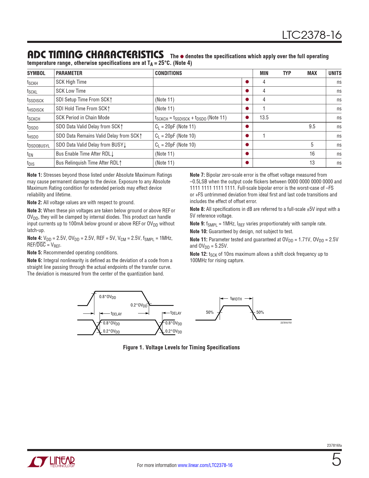 LTC2378-16 aDc TiMing characTerisTicsThe l denotes the specifications which apply over the full operatingtemperature range, otherwise specifications are at TA = 25°C. (Note 4) SYMBOLPARAMETERCONDITIONSMINTYPMAXUNITS tSCKH SCK High Time l 4 ns tSCKL SCK Low Time l 4 ns tSSDISCK SDI Setup Time From SCK↑ (Note 11) l 4 ns tHSDISCK SDI Hold Time From SCK↑ (Note 11) l 1 ns tSCKCH SCK Period in Chain Mode tSCKCH = tSSDISCK + tDSDO (Note 11) l 13.5 ns tDSDO SDO Data Valid Delay from SCK↑ CL = 20pF (Note 11) l 9.5 ns tHSDO SDO Data Remains Valid Delay from SCK↑ CL = 20pF (Note 10) l 1 ns tDSDOBUSYL SDO Data Valid Delay from BUSY↓ CL = 20pF (Note 10) l 5 ns tEN Bus Enable Time After RDL↓ (Note 11) l 16 ns tDIS Bus Relinquish Time After RDL↑ (Note 11) l 13 ns Note 1: Stresses beyond those listed under Absolute Maximum Ratings Note 7: Bipolar zero-scale error is the offset voltage measured from may cause permanent damage to the device. Exposure to any Absolute –0.5LSB when the output code flickers between 0000 0000 0000 0000 and Maximum Rating condition for extended periods may effect device 1111 1111 1111 1111. Full-scale bipolar error is the worst-case of –FS reliability and lifetime. or +FS untrimmed deviation from ideal first and last code transitions and Note 2: All voltage values are with respect to ground. includes the effect of offset error. Note 3: When these pin voltages are taken below ground or above REF or Note 8: All specifications in dB are referred to a full-scale ±5V input with a OV 5V reference voltage. DD, they will be clamped by internal diodes. This product can handle input currents up to 100mA below ground or above REF or OVDD without Note 9: fSMPL = 1MHz, IREF varies proportionately with sample rate. latch-up. Note 10: Guaranteed by design, not subject to test. Note 4: VDD = 2.5V, OVDD = 2.5V, REF = 5V, VCM = 2.5V, fSMPL = 1MHz, Note 11: Parameter tested and guaranteed at OVDD = 1.71V, OVDD = 2.5V REF/DGC = VREF. and OVDD = 5.25V. Note 5: Recommended operating conditions. Note 12: tSCK of 10ns maximum allows a shift clock frequency up to Note 6: Integral nonlinearity is defined as the deviation of a code from a 100MHz for rising capture. straight line passing through the actual endpoints of the transfer curve. The deviation is measured from the center of the quantization band. 0.8*OVDD tWIDTH 0.2*OVDD t tDELAY 50% 50% DELAY 237816 F01 0.8*OVDD 0.8*OVDD 0.2*OVDD 0.2*OVDD Figure 1. Voltage Levels for Timing Specifications 237816fa For more information www.linear.com/LTC2378-16 5 Document Outline Features Applications Typical Application Description Absolute Maximum Ratings Pin Configuration Order Information Electrical Characteristics Converter Characteristics Dynamic Accuracy Reference Input Digital Inputs and Digital Outputs Power Requirements ADC Timing Characteristics Typical Performance Characteristics Pin Functions Functional Block Diagram Timing Diagram Applications Information Board Layout Package Description Revision History Typical Application Related Parts