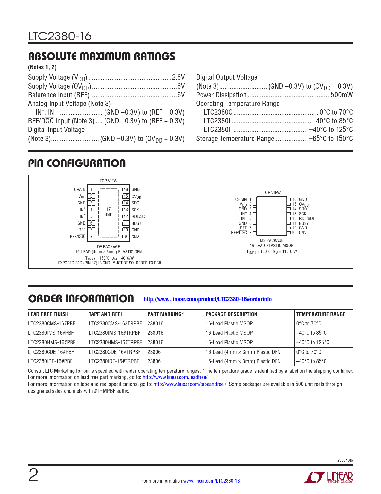 ORDER INFORMATION http://www.linear.com/product/LTC2380-16#orderinfo LEAD FREE FINISH TAPE AND REEL PART MARKING* PACKAGE DESCRIPTION TEMPERATURE RANGE