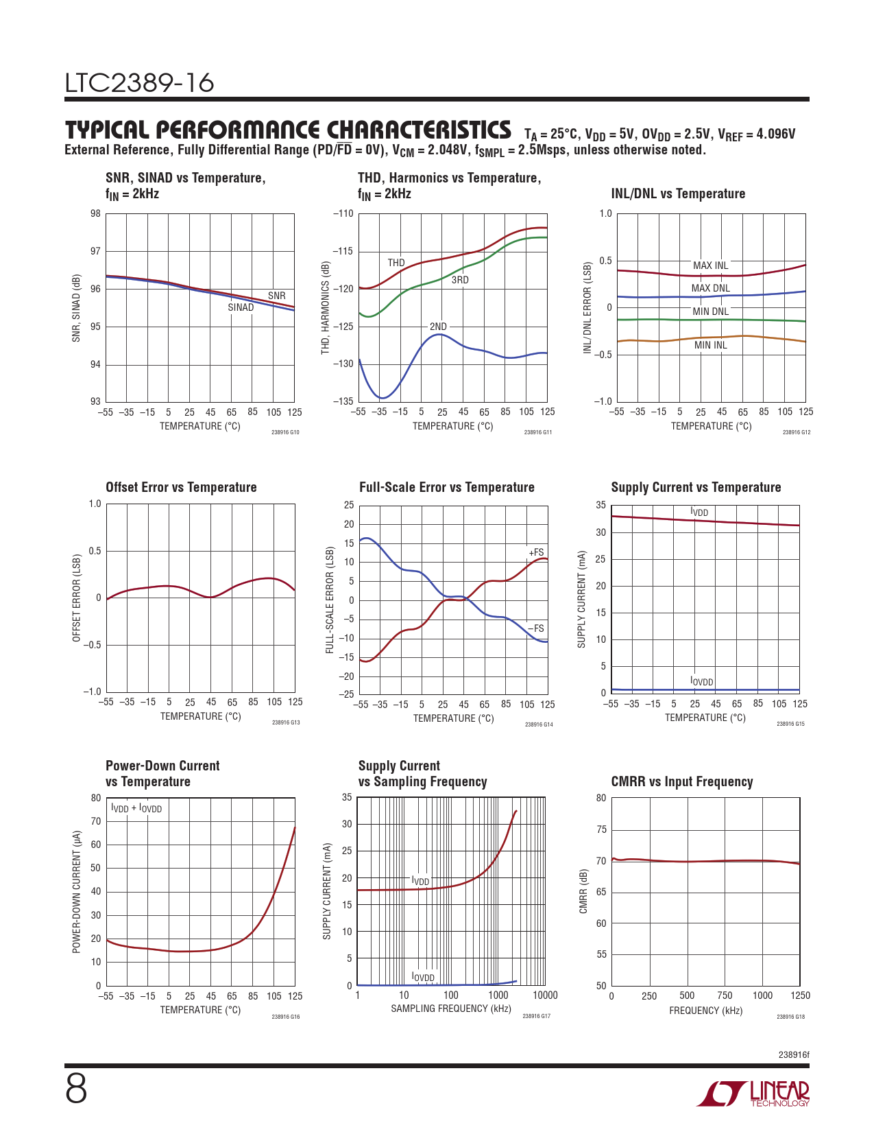 98 –110 1.0 97 –115 THD 0.5 MAX INL 3RD 96 –120 MAX DNL SNR SINAD 0 MIN DNL 95 –125 2ND SNR, SINAD (dB) /DNL ERROR (LSB) THD, HARMONICS (dB) INL MIN INL –0.5 94 –130 93 –135 –1.0 –55 –35 –15 5 25 45 65 85 105 125 –55 –35 –15 5 25 45 65 85 105 125 –55 –35 –15 5 25 45 65 85 105 125 TEMPERATURE (°C) TEMPERATURE (°C) TEMPERATURE (°C) 238916 G10 238916 G11 238916 G12