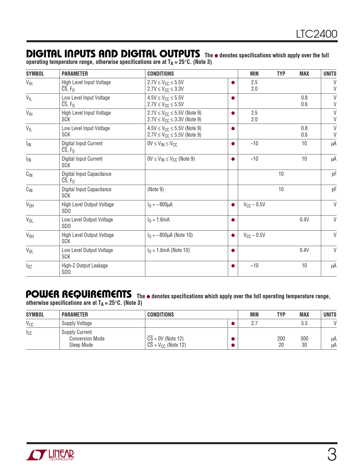 VIH High Level Input Voltage 2.7V ≤ VCC ≤ 5.5V ● 2.5 V CS, FO 2.7V ≤ VCC ≤ 3.3V 2.0 V VIL Low Level Input Voltage 4.5V ≤ VCC ≤ 5.5V ● 0.8 V CS, FO 2.7V ≤ VCC ≤ 5.5V 0.6 V VIH High Level Input Voltage 2.7V ≤ VCC ≤ 5.5V (Note 9) ● 2.5 V SCK 2.7V ≤ VCC ≤ 3.3V (Note 9) 2.0 V VIL Low Level Input Voltage 4.5V ≤ VCC ≤ 5.5V (Note 9) ● 0.8 V SCK 2.7V ≤ VCC ≤ 5.5V (Note 9) 0.6 V IIN Digital Input Current 0V ≤ VIN ≤ VCC ● –10 10 µA CS, FO IIN Digital Input Current 0V ≤ VIN ≤ VCC (Note 9) ● –10 10 µA SCK CIN Digital Input Capacitance 10 pF CS, FO CIN Digital Input Capacitance (Note 9) 10 pF SCK VOH High Level Output Voltage IO = – 800µA ● VCC – 0.5V V SDO VOL Low Level Output Voltage IO = 1.6mA ● 0.4V V SDO VOH High Level Output Voltage IO = – 800µA (Note 10) ● VCC – 0.5V V SCK VOL Low Level Output Voltage IO = 1.6mA (Note 10) ● 0.4V V SCK IOZ High-Z Output Leakage ● –10 10 µA SDO