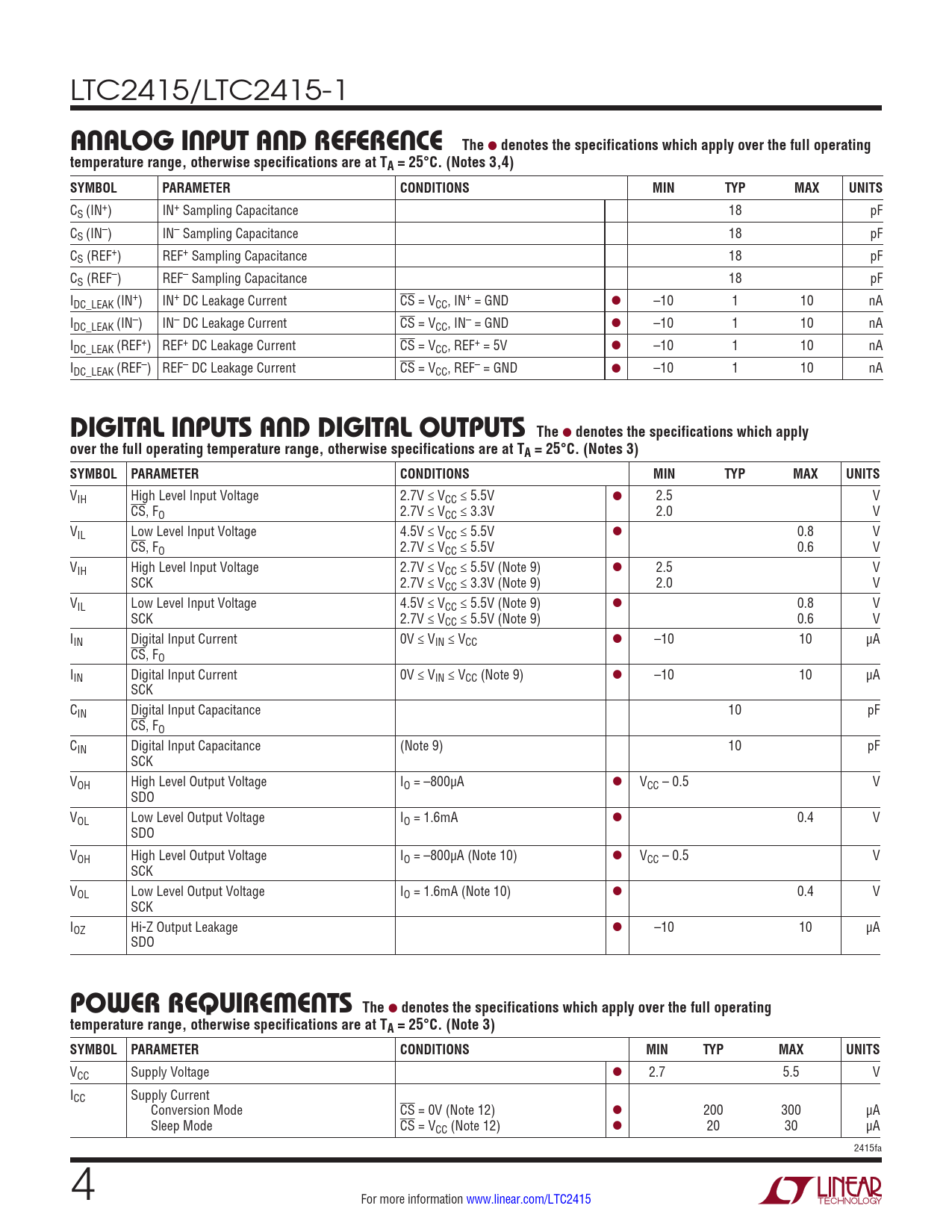 LTC2415/LTC2415-1 ANALOG INPUT AND REFERENCE The l denotes the specifications which apply over the full operatingtemperature range, otherwise specifications are at TA = 25°C. (Notes 3,4) SYMBOLPARAMETERCONDITIONSMINTYPMAXUNITS CS (IN+) IN+ Sampling Capacitance 18 pF CS (IN–) IN– Sampling Capacitance 18 pF CS (REF+) REF+ Sampling Capacitance 18 pF CS (REF–) REF– Sampling Capacitance 18 pF IDC_LEAK (IN+) IN+ DC Leakage Current CS = VCC, IN+ = GND ● –10 1 10 nA IDC_LEAK (IN–) IN– DC Leakage Current CS = VCC, IN– = GND ● –10 1 10 nA IDC_LEAK (REF+) REF+ DC Leakage Current CS = VCC, REF+ = 5V ● –10 1 10 nA IDC_LEAK (REF–) REF– DC Leakage Current CS = VCC, REF– = GND ● –10 1 10 nA DIGITAL INPUTS AND DIGITAL OUTPUTS The l denotes the specifications which applyover the full operating temperature range, otherwise specifications are at TA = 25°C. (Notes 3) SYMBOL PARAMETERCONDITIONSMINTYPMAXUNITS VIH High Level Input Voltage 2.7V ≤ VCC ≤ 5.5V ● 2.5 V CS, FO 2.7V ≤ VCC ≤ 3.3V 2.0 V VIL Low Level Input Voltage 4.5V ≤ VCC ≤ 5.5V ● 0.8 V CS, FO 2.7V ≤ VCC ≤ 5.5V 0.6 V VIH High Level Input Voltage 2.7V ≤ VCC ≤ 5.5V (Note 9) ● 2.5 V SCK 2.7V ≤ VCC ≤ 3.3V (Note 9) 2.0 V VIL Low Level Input Voltage 4.5V ≤ VCC ≤ 5.5V (Note 9) ● 0.8 V SCK 2.7V ≤ VCC ≤ 5.5V (Note 9) 0.6 V IIN Digital Input Current 0V ≤ VIN ≤ VCC ● –10 10 µA CS, FO IIN Digital Input Current 0V ≤ VIN ≤ VCC (Note 9) ● –10 10 µA SCK CIN Digital Input Capacitance 10 pF CS, FO CIN Digital Input Capacitance (Note 9) 10 pF SCK VOH High Level Output Voltage IO = –800µA ● VCC – 0.5 V SDO VOL Low Level Output Voltage IO = 1.6mA ● 0.4 V SDO VOH High Level Output Voltage IO = –800µA (Note 10) ● VCC – 0.5 V SCK VOL Low Level Output Voltage IO = 1.6mA (Note 10) ● 0.4 V SCK IOZ Hi-Z Output Leakage ● –10 10 µA SDO POWER REQUIREMENTS The l denotes the specifications which apply over the full operatingtemperature range, otherwise specifications are at TA = 25°C. (Note 3) SYMBOL PARAMETERCONDITIONSMINTYPMAXUNITS VCC Supply Voltage l 2.7 5.5 V ICC Supply Current Conversion Mode CS = 0V (Note 12) l 200 300 µA Sleep Mode CS = VCC (Note 12) l 20 30 µA 2415fa 4 For more information www.linear.com/LTC2415 Document Outline Features Applications Typical Application Description Absolute Maximum Ratings Order Information Electrical Characteristics Pin Configuration Converter Characteristics The l denotes the specifications which apply over the full operating temperature range, otherwise specifications are at TA = 25°C. (Notes 3,4) Analog Input and Reference The l denotes the specifications which apply over the full operating temperature range, otherwise specifications are at TA = 25°C. (Notes 3,4) Electrical Characteristics Digital Inputs and Digital Outputs The l denotes the specifications which apply over the full operating temperature range, otherwise specifications are at TA = 25°C. (Notes 3) Power Requirements The l denotes the specifications which apply over the full operating temperature range, otherwise specifications are at TA = 25°C. (Note 3) Analog Input and Reference The l denotes the specifications which apply over the full operating temperature range, otherwise specifications are at TA = 25°C. (Notes 3,4) Timing Characteristics The l denotes the specifications which apply over the full operating temperature range, otherwise specifications are at TA = 25°C. (Notes 3,4) Typical Performance Characteristics Pin Functions Functional Block Diagram Test Circuits Applications Information Typical Applications PCB Layout and Film Package Description Revision History Typical Application Related Parts