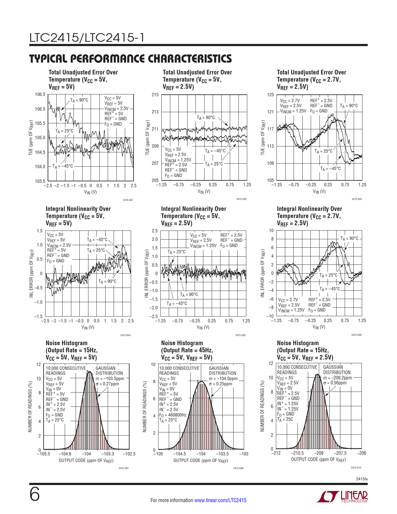 106.5 215 125 VCC = 5V TA = 90°C V VCC = 2.7V REF+ = 2.5V REF = 5V V REF– = GND T 106.0 V REF = 2.5V A = 90°C INCM = 2.5V REF+ = 5V 213 121 VINCM = 1.25V FO = GND ) REF– = GND ) TA = 90°C ) 105.5 REF FO = GND REF REF T 211 117 A = 25°C 105.0 209 113 VCC = 5V T T TUE (ppm OF V 104.5 TUE (ppm OF V V A = –45°C A = 25°C REF = 2.5V TUE (ppm OF V V 207 INCM = 1.25V 109 104.0 T REF+ = 2.5V T A = –45°C A = 25°C REF– = GND TA = –45°C FO = GND 103.5 205 105 –2.5 –2 –1.5 –1 –0.5 0 0.5 1 1.5 2 2.5 –1.25 –0.75 –0.25 0.25 0.75 1.25 –1.25 –0.75 –0.25 0.25 0.75 1.25 VIN (V) VIN (V) VIN (V) 2415 G01 2415 G02 2415 G03
