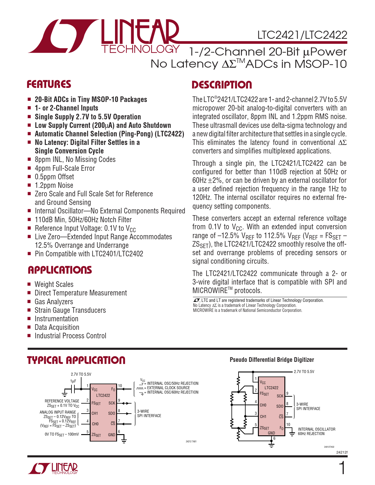 LTC2421/LTC2422 1-/2-Channel 20-Bit µPower No Latency ∆ΣTMADCs in MSOP-10
