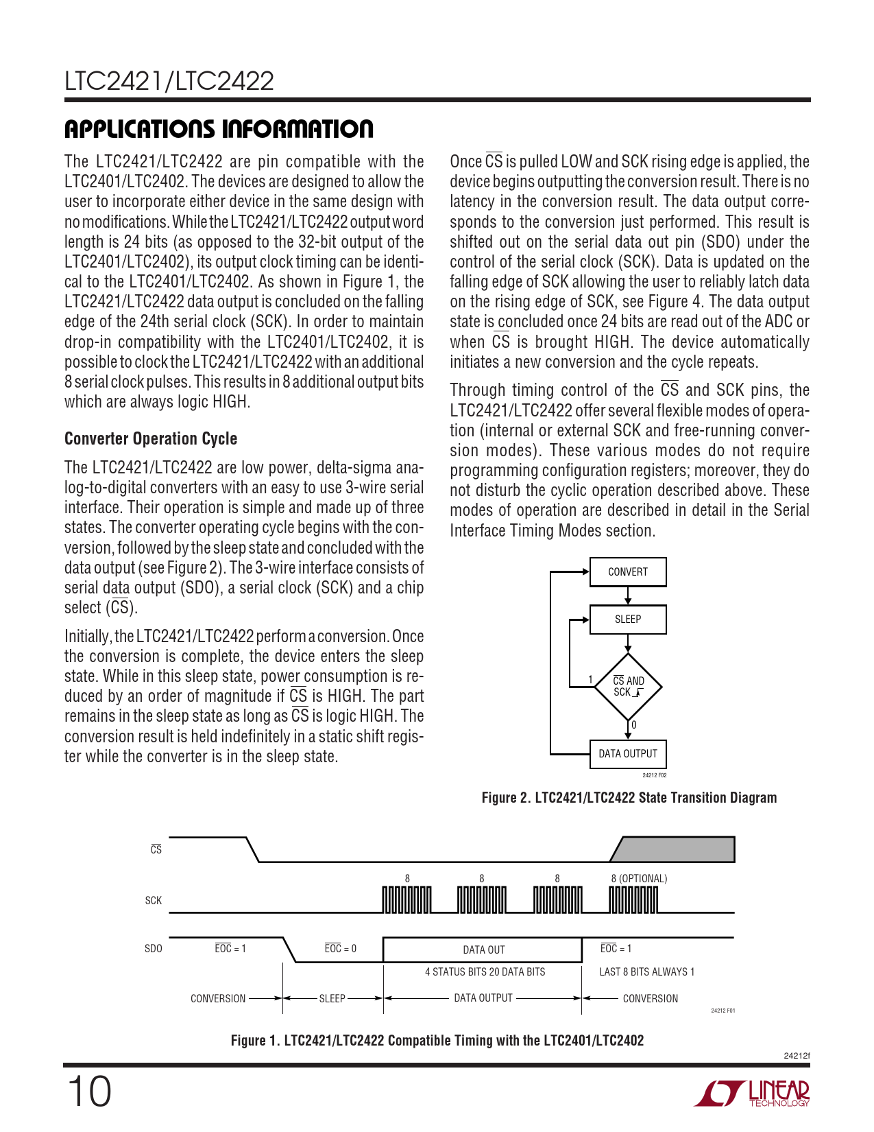 LTC2421/LTC2422 UUWUAPPLICATIO S I FOR ATIO The LTC2421/LTC2422 are pin compatible with the Once CS is pulled LOW and SCK rising edge is applied, the LTC2401/LTC2402. The devices are designed to allow the device begins outputting the conversion result. There is no user to incorporate either device in the same design with latency in the conversion result. The data output corre- no modifications. While the LTC2421/LTC2422 output word sponds to the conversion just performed. This result is length is 24 bits (as opposed to the 32-bit output of the shifted out on the serial data out pin (SDO) under the LTC2401/LTC2402), its output clock timing can be identi- control of the serial clock (SCK). Data is updated on the cal to the LTC2401/LTC2402. As shown in Figure 1, the falling edge of SCK allowing the user to reliably latch data LTC2421/LTC2422 data output is concluded on the falling on the rising edge of SCK, see Figure 4. The data output edge of the 24th serial clock (SCK). In order to maintain state is concluded once 24 bits are read out of the ADC or drop-in compatibility with the LTC2401/LTC2402, it is when CS is brought HIGH. The device automatically possible to clock the LTC2421/LTC2422 with an additional initiates a new conversion and the cycle repeats. 8 serial clock pulses. This results in 8 additional output bits Through timing control of the CS and SCK pins, the which are always logic HIGH. LTC2421/LTC2422 offer several flexible modes of opera- tion (internal or external SCK and free-running conver- Converter Operation Cycle sion modes). These various modes do not require The LTC2421/LTC2422 are low power, delta-sigma ana- programming configuration registers; moreover, they do log-to-digital converters with an easy to use 3-wire serial not disturb the cyclic operation described above. These interface. Their operation is simple and made up of three modes of operation are described in detail in the Serial states. The converter operating cycle begins with the con- Interface Timing Modes section. version, followed by the sleep state and concluded with the data output (see Figure 2). The 3-wire interface consists of CONVERT serial data output (SDO), a serial clock (SCK) and a chip select (CS). SLEEP Initially, the LTC2421/LTC2422 perform a conversion. Once the conversion is complete, the device enters the sleep state. While in this sleep state, power consumption is re- 1 CS AND duced by an order of magnitude if CS is HIGH. The part SCK remains in the sleep state as long as CS is logic HIGH. The 0 conversion result is held indefinitely in a static shift regis- ter while the converter is in the sleep state. DATA OUTPUT 24212 F02 Figure 2. LTC2421/LTC2422 State Transition Diagram CS 8 8 8 8 (OPTIONAL) SCK SDO EOC = 1 EOC = 0 DATA OUT EOC = 1 4 STATUS BITS 20 DATA BITS LAST 8 BITS ALWAYS 1 CONVERSION SLEEP DATA OUTPUT CONVERSION 24212 F01 Figure 1. LTC2421/LTC2422 Compatible Timing with the LTC2401/LTC2402 24212f 10
