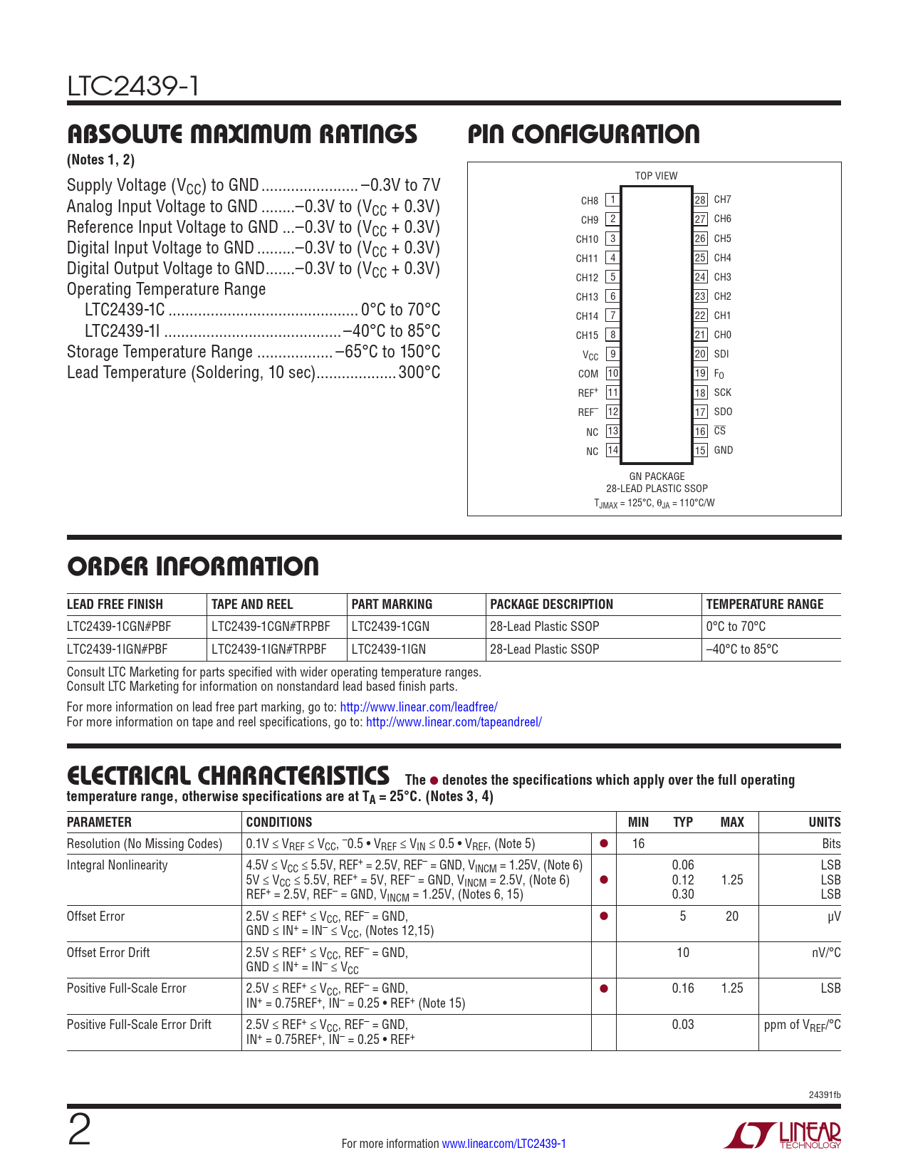 LTC2439-1 ABSOLUTE MAXIMUM RATINGSPIN CONFIGURATION(Notes 1, 2) Supply Voltage (V TOP VIEW CC) to GND ... –0.3V to 7V Analog Input Voltage to GND ..–0.3V to (V CH8 1 28 CH7 CC + 0.3V) Reference Input Voltage to GND ...–0.3V to (V CH9 2 27 CH6 CC + 0.3V) Digital Input Voltage to GND ...–0.3V to (V CH10 3 26 CH5 CC + 0.3V) Digital Output Voltage to GND ...–0.3V to (V CH11 4 25 CH4 CC + 0.3V) CH12 5 24 CH3 Operating Temperature Range CH13 6 23 CH2 LTC2439-1C ... 0°C to 70°C CH14 7 22 CH1 LTC2439-1I ..–40°C to 85°C CH15 8 21 CH0 Storage Temperature Range .. –65°C to 150°C V 9 20 CC SDI Lead Temperature (Soldering, 10 sec) ...300°C COM 10 19 FO REF+ 11 18 SCK REF– 12 17 SDO NC 13 16 CS NC 14 15 GND GN PACKAGE 28-LEAD PLASTIC SSOP TJMAX = 125°C, θJA = 110°C/W ORDER INFORMATION LEAD FREE FINISHTAPE AND REELPART MARKINGPACKAGE DESCRIPTIONTEMPERATURE RANGE LTC2439-1CGN#PBF LTC2439-1CGN#TRPBF LTC2439-1CGN 28-Lead Plastic SSOP 0°C to 70°C LTC2439-1IGN#PBF LTC2439-1IGN#TRPBF LTC2439-1IGN 28-Lead Plastic SSOP –40°C to 85°C Consult LTC Marketing for parts specified with wider operating temperature ranges. Consult LTC Marketing for information on nonstandard lead based finish parts. For more information on lead free part marking, go to: http://www.linear.com/leadfree/ For more information on tape and reel specifications, go to: http://www.linear.com/tapeandreel/ ELECTRICAL CHARACTERISTICSThe l denotes the specifications which apply over the full operatingtemperature range, otherwise specifications are at TA = 25°C. (Notes 3, 4) PARAMETERCONDITIONSMINTYPMAXUNITS Resolution (No Missing Codes) 0.1V ≤ VREF ≤ VCC, –0.5 • VREF ≤ VIN ≤ 0.5 • VREF, (Note 5) l 16 Bits Integral Nonlinearity 4.5V ≤ VCC ≤ 5.5V, REF+ = 2.5V, REF– = GND, VINCM = 1.25V, (Note 6) 0.06 LSB 5V ≤ VCC ≤ 5.5V, REF+ = 5V, REF– = GND, VINCM = 2.5V, (Note 6) l 0.12 1.25 LSB REF+ = 2.5V, REF– = GND, VINCM = 1.25V, (Notes 6, 15) 0.30 LSB Offset Error 2.5V ≤ REF+ ≤ VCC, REF– = GND, l 5 20 µV GND ≤ IN+ = IN– ≤ VCC, (Notes 12,15) Offset Error Drift 2.5V ≤ REF+ ≤ VCC, REF– = GND, 10 nV/°C GND ≤ IN+ = IN– ≤ VCC Positive Full-Scale Error 2.5V ≤ REF+ ≤ VCC, REF– = GND, l 0.16 1.25 LSB IN+ = 0.75REF+, IN– = 0.25 • REF+ (Note 15) Positive Full-Scale Error Drift 2.5V ≤ REF+ ≤ VCC, REF– = GND, 0.03 ppm of VREF/°C IN+ = 0.75REF+, IN– = 0.25 • REF+ 24391fb 2 For more information www.linear.com/LTC2439-1 Document Outline Features Applications Typical Application Absolute Maximum Ratings Order Information Electrical Characteristics Converter Characteristics Analog Input and Reference Digital Inputs and Digital Outputs POWER REQUIREMENTS Timing Characteristics Pin Functions FUNCTIONAL Block Diagram Test CircuitS Applications Information Package Description Revision History Typical Application Related Parts