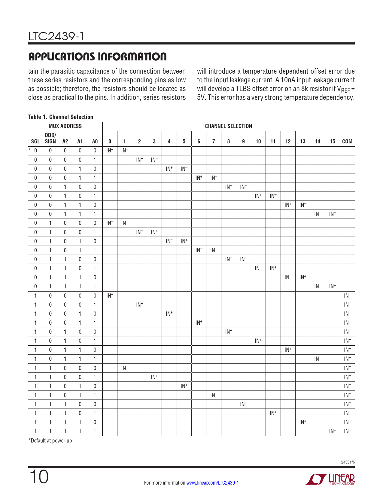 APPLICATIONS INFORMATION. Table 1. Channel Selection. MUX ADDRESS. CHANNEL SELECTION. ODD/. SGL SIGN A2. 15 COM
