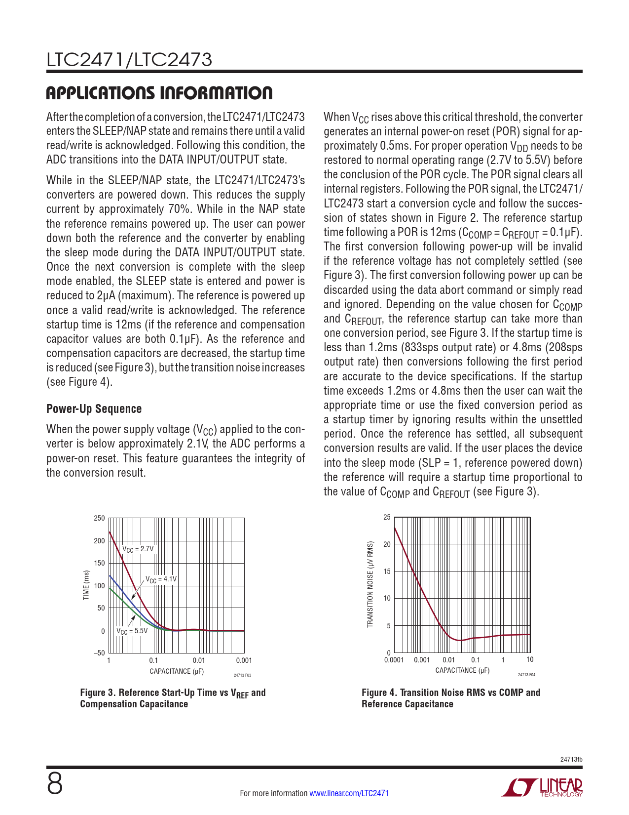 After the completion of a conversion, the LTC2471/LTC2473 When VCC rises above this critical threshold, the converter enters the SLEEP/NAP state and remains there until a valid generates an internal power-on reset (POR) signal for ap- read/write is acknowledged. Following this condition, the proximately 0.5ms. For proper operation VDD needs to be ADC transitions into the DATA INPUT/OUTPUT state. restored to normal operating range (2.7V to 5.5V) before While in the SLEEP/NAP state, the LTC2471/LTC2473’s the conclusion of the POR cycle. The POR signal clears all converters are powered down. This reduces the supply internal registers. Following the POR signal, the LTC2471/ current by approximately 70%. While in the NAP state LTC2473 start a conversion cycle and follow the succes- the reference remains powered up. The user can power sion of states shown in Figure 2. The reference startup down both the reference and the converter by enabling time following a POR is 12ms (CCOMP = CREFOUT = 0.1μF). the sleep mode during the DATA INPUT/OUTPUT state. The first conversion following power-up will be invalid Once the next conversion is complete with the sleep if the reference voltage has not completely settled (see mode enabled, the SLEEP state is entered and power is Figure 3). The first conversion following power up can be reduced to 2μA (maximum). The reference is powered up discarded using the data abort command or simply read once a valid read/write is acknowledged. The reference and ignored. Depending on the value chosen for CCOMP startup time is 12ms (if the reference and compensation and CREFOUT, the reference startup can take more than capacitor values are both 0.1μF). As the reference and one conversion period, see Figure 3. If the startup time is compensation capacitors are decreased, the startup time less than 1.2ms (833sps output rate) or 4.8ms (208sps is reduced (see Figure 3), but the transition noise increases output rate) then conversions following the first period (see Figure 4). are accurate to the device specifications. If the startup time exceeds 1.2ms or 4.8ms then the user can wait the