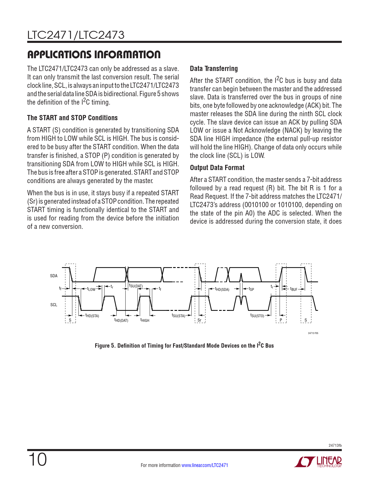 LTC2471/LTC2473 applicaTions inForMaTion The LTC2471/LTC2473 can only be addressed as a slave. Data Transferring It can only transmit the last conversion result. The serial After the START condition, the I2C bus is busy and data clock line, SCL, is always an input to the LTC2471/LTC2473 transfer can begin between the master and the addressed and the serial data line SDA is bidirectional. Figure 5 shows slave. Data is transferred over the bus in groups of nine the definition of the I2C timing. bits, one byte followed by one acknowledge (ACK) bit. The The START and STOP Conditions master releases the SDA line during the ninth SCL clock cycle. The slave device can issue an ACK by pulling SDA A START (S) condition is generated by transitioning SDA LOW or issue a Not Acknowledge (NACK) by leaving the from HIGH to LOW while SCL is HIGH. The bus is consid- SDA line HIGH impedance (the external pull-up resistor ered to be busy after the START condition. When the data will hold the line HIGH). Change of data only occurs while transfer is finished, a STOP (P) condition is generated by the clock line (SCL) is LOW. transitioning SDA from LOW to HIGH while SCL is HIGH. Output Data Format The bus is free after a STOP is generated. START and STOP conditions are always generated by the master. After a START condition, the master sends a 7-bit address followed by a read request (R) bit. The bit R is 1 for a When the bus is in use, it stays busy if a repeated START Read Request. If the 7-bit address matches the LTC2471/ (Sr) is generated instead of a STOP condition. The repeated LTC2473’s address (0010100 or 1010100, depending on START timing is functionally identical to the START and the state of the pin A0) the ADC is selected. When the is used for reading from the device before the initiation device is addressed during the conversion state, it does of a new conversion. SDA t t SU(DAT) tf t r tr LOW tf tHD(SDA) tSP tBUF SCL tHD(STA) tSU(STA) tSU(STO) S tHD(DAT) tHIGH Sr P S 24713 F05 Figure 5. Definition of Timing for Fast/Standard Mode Devices on the I2C Bus 24713fb 10 For more information www.linear.com/LTC2471 Document Outline Features Applications Description Typical Application Absolute Maximum Ratings Pin Configuration Order Information Electrical Characteristics Analog Inputs Power Requirements I2C Inputs and Outputs I2C Timing Characteristics Typical Performance Characteristics Pin Functions Block Diagram Applications Information Package Description Revision History Typical Application Related Parts