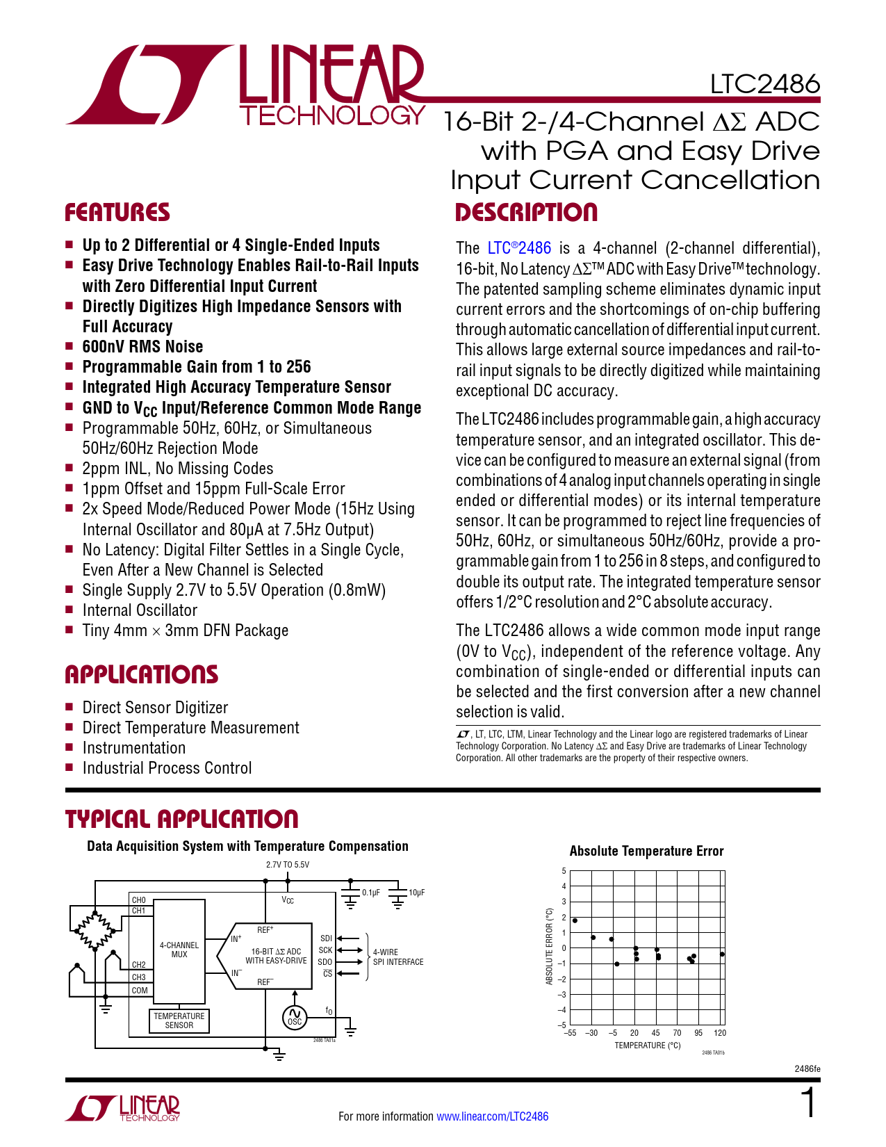 LTC2486 16-Bit 2-/4-Channel ΔS ADC with PGA and Easy Drive Input Current Cancellation FEATURESDESCRIPTION n Up to 2 Differential or 4 Single-Ended Inputs The LTC®2486 is a 4-channel (2-channel differential), n Easy Drive Technology Enables Rail-to-Rail Inputs 16-bit, No Latency ΔS™ ADC with Easy Drive™ technology. with Zero Differential Input Current The patented sampling scheme eliminates dynamic input n Directly Digitizes High Impedance Sensors with current errors and the shortcomings of on-chip buffering Full Accuracy through automatic cancel ation of differential input current. n 600nV RMS Noise This allows large external source impedances and rail-to- n Programmable Gain from 1 to 256 rail input signals to be directly digitized while maintaining n Integrated High Accuracy Temperature Sensor exceptional DC accuracy. n GND to VCC Input/Reference Common Mode Range The LTC2486 includes programmable gain, a high accuracy n Programmable 50Hz, 60Hz, or Simultaneous temperature sensor, and an integrated oscillator. This de- 50Hz/60Hz Rejection Mode vice can be configured to measure an external signal (from n 2ppm INL, No Missing Codes combinations of 4 analog input channels operating in single n 1ppm Offset and 15ppm Full-Scale Error ended or differential modes) or its internal temperature n 2x Speed Mode/Reduced Power Mode (15Hz Using sensor. It can be programmed to reject line frequencies of Internal Oscillator and 80µA at 7.5Hz Output) 50Hz, 60Hz, or simultaneous 50Hz/60Hz, provide a pro- n No Latency: Digital Filter Settles in a Single Cycle, grammable gain from 1 to 256 in 8 steps, and configured to Even After a New Channel is Selected double its output rate. The integrated temperature sensor n Single Supply 2.7V to 5.5V Operation (0.8mW) offers 1/2°C resolution and 2°C absolute accuracy. n Internal Oscillator n Tiny 4mm × 3mm DFN Package The LTC2486 allows a wide common mode input range (0V to VCC), independent of the reference voltage. Any APPLICATIONS combination of single-ended or differential inputs can be selected and the first conversion after a new channel n Direct Sensor Digitizer selection is valid. n Direct Temperature Measurement L, LT, LTC, LTM, Linear Technology and the Linear logo are registered trademarks of Linear n Technology Corporation. No Latency ΔS and Easy Drive are trademarks of Linear Technology Instrumentation Corporation. All other trademarks are the property of their respective owners. n Industrial Process Control TYPICAL APPLICATIONData Acquisition System with Temperature CompensationAbsolute Temperature Error 2.7V TO 5.5V 5 4 0.1µF 10µF CH0 VCC 3 CH1 2 REF+ 1 IN+ SDI 4-CHANNEL 16-BIT ∆Σ ADC SCK 0 MUX 4-WIRE WITH EASY-DRIVE SDO SPI INTERFACE CH2 –1 IN– CS CH3 REF– ABSOLUTE ERROR (°C) –2 COM –3 fO –4 TEMPERATURE SENSOR OSC –5–55 –30 –5 20 45 70 95 120 2486 TA01a TEMPERATURE (°C) 2486 TA01b 2486fe For more information www.linear.com/LTC2486 1 Document Outline Features Applications Description Typical Application Absolute Maximum Ratings Pin Configuration Order Information Electrical Characteristics (Normal Speed) Electrical Characteristics (2x Speed) Converter Characteristics Analog Input and Reference Digital Inputs and Digital Outputs Power Requirements Typical Performance Characteristics Pin Functions Functional Block Diagram Test Circuits Timing Diagrams Applications Information Package Description Revision History Typical Application Related Parts