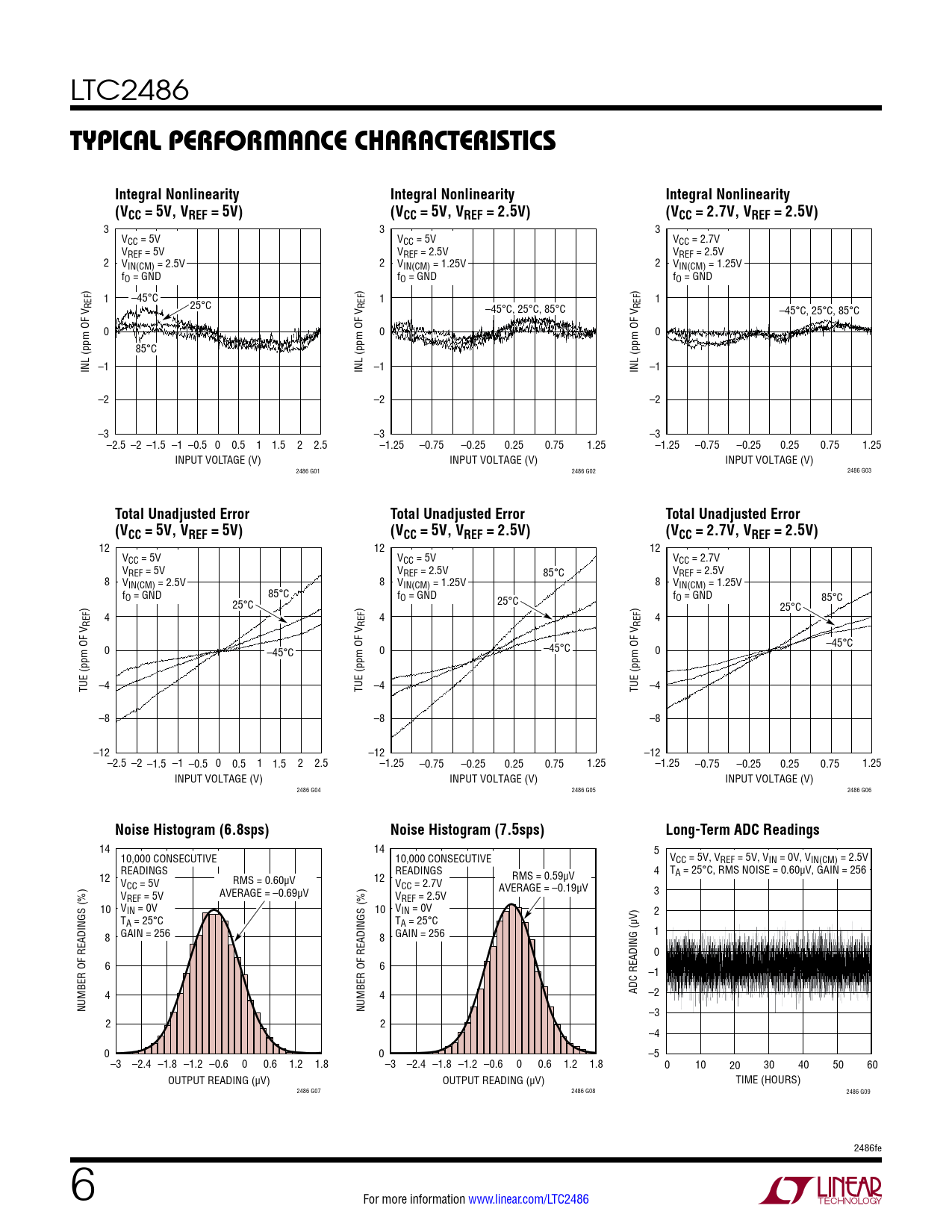 3 3 3 VCC = 5V VCC = 5V VCC = 2.7V VREF = 5V VREF = 2.5V VREF = 2.5V 2 VIN(CM) = 2.5V 2 VIN(CM) = 1.25V 2 VIN(CM) = 1.25V fO = GND fO = GND fO = GND ) 1 –45°C 1 1 REF 25°C REF –45°C, 25°C, 85°C REF –45°C, 25°C, 85°C 0 0 0 85°C INL (ppm OF V –1 INL (ppm OF V –1 INL (ppm OF V –1 –2 –2 –2 –3 –3 –3 –2.5 –2 –1.5 –1 –0.5 0 0.5 1 1.5 2 2.5 –1.25 –0.75 –0.25 0.25 0.75 1.25 –1.25 –0.75 –0.25 0.25 0.75 1.25 INPUT VOLTAGE (V) INPUT VOLTAGE (V) INPUT VOLTAGE (V) 2486 G01 2486 G02 2486 G03
