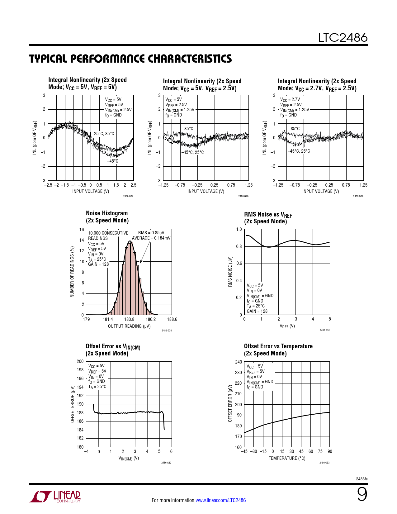 3 3 3 VCC = 5V VCC = 5V VCC = 2.7V VREF = 5V VREF = 2.5V VREF = 2.5V 2 VIN(CM) = 2.5V 2 VIN(CM) = 1.25V 2 VIN(CM) = 1.25V fO = GND fO = GND fO = GND ) 1 1 1 REF REF 85°C REF 85°C 25°C, 85°C 0 0 0 INL (ppm OF V –1 INL (ppm OF V –1 –45°C, 25°C INL (ppm OF V –1 –45°C, 25°C –45°C –2 –2 –2 –3 –3 –3 –2.5 –2 –1.5 –1 –0.5 0 0.5 1 1.5 2 2.5 –1.25 –0.75 –0.25 0.25 0.75 1.25 –1.25 –0.75 –0.25 0.25 0.75 1.25 INPUT VOLTAGE (V) INPUT VOLTAGE (V) INPUT VOLTAGE (V) 2486 G27 2486 G28 2486 G29