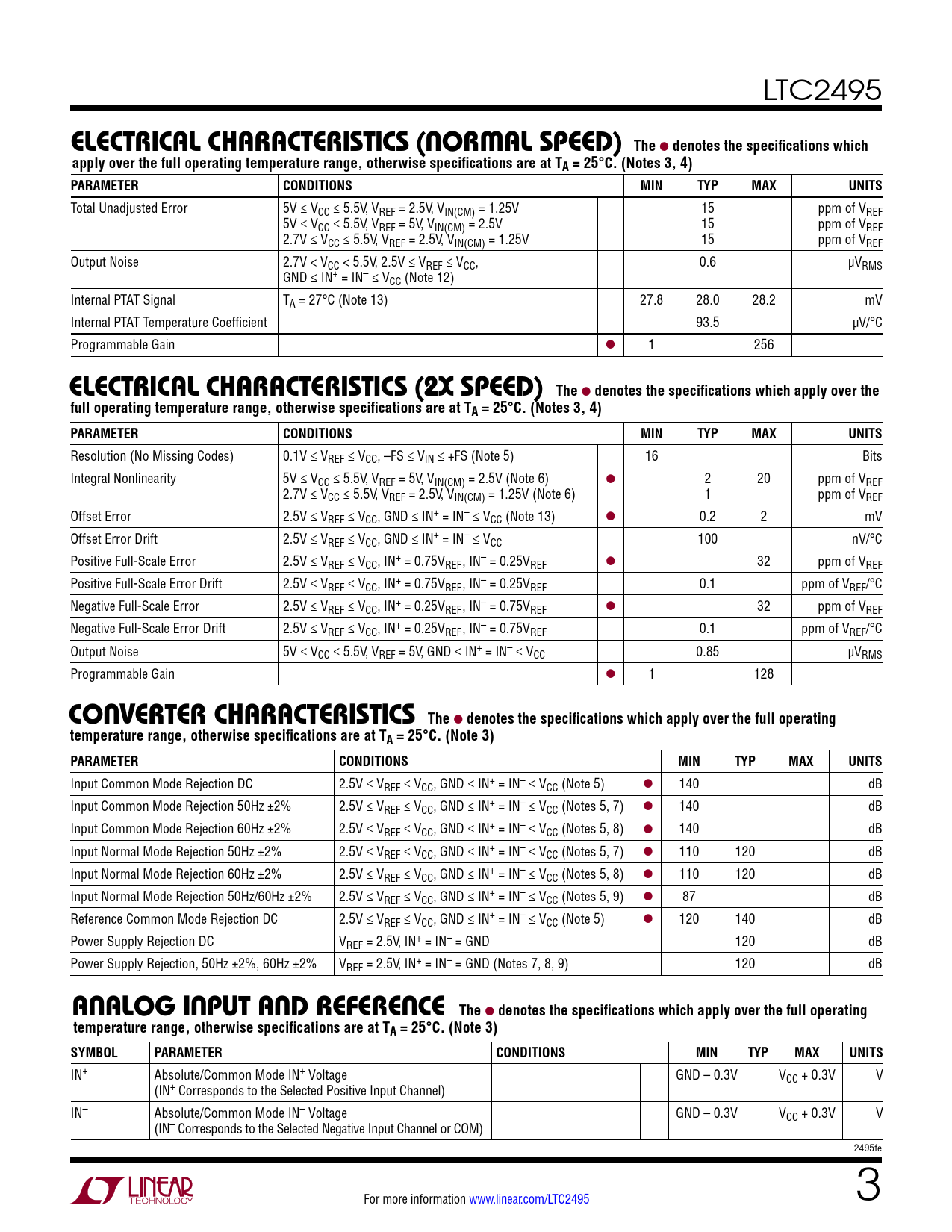 IN+ Absolute/Common Mode IN+ Voltage GND – 0.3V VCC + 0.3V V (IN+ Corresponds to the Selected Positive Input Channel) IN– Absolute/Common Mode IN– Voltage GND – 0.3V VCC + 0.3V V (IN– Corresponds to the Selected Negative Input Channel or COM) 2495fe For more information www.linear.com/LTC2495 3 Document Outline Features Description Applications Typical Application Absolute Maximum Ratings Pin Configuration order information Electrical Characteristics (Normal Speed) Electrical Characteristics (2x Speed) Converter Characteristics Analog Input and Reference I2C Inputs And Digital Outputs Power Requirements Digital Inputs And Digital Outputs I2C Timing Characteristics Typical Performance Characteristics Pin Functions Functional Block Diagram Applications Information Package Description Revision History Related Parts