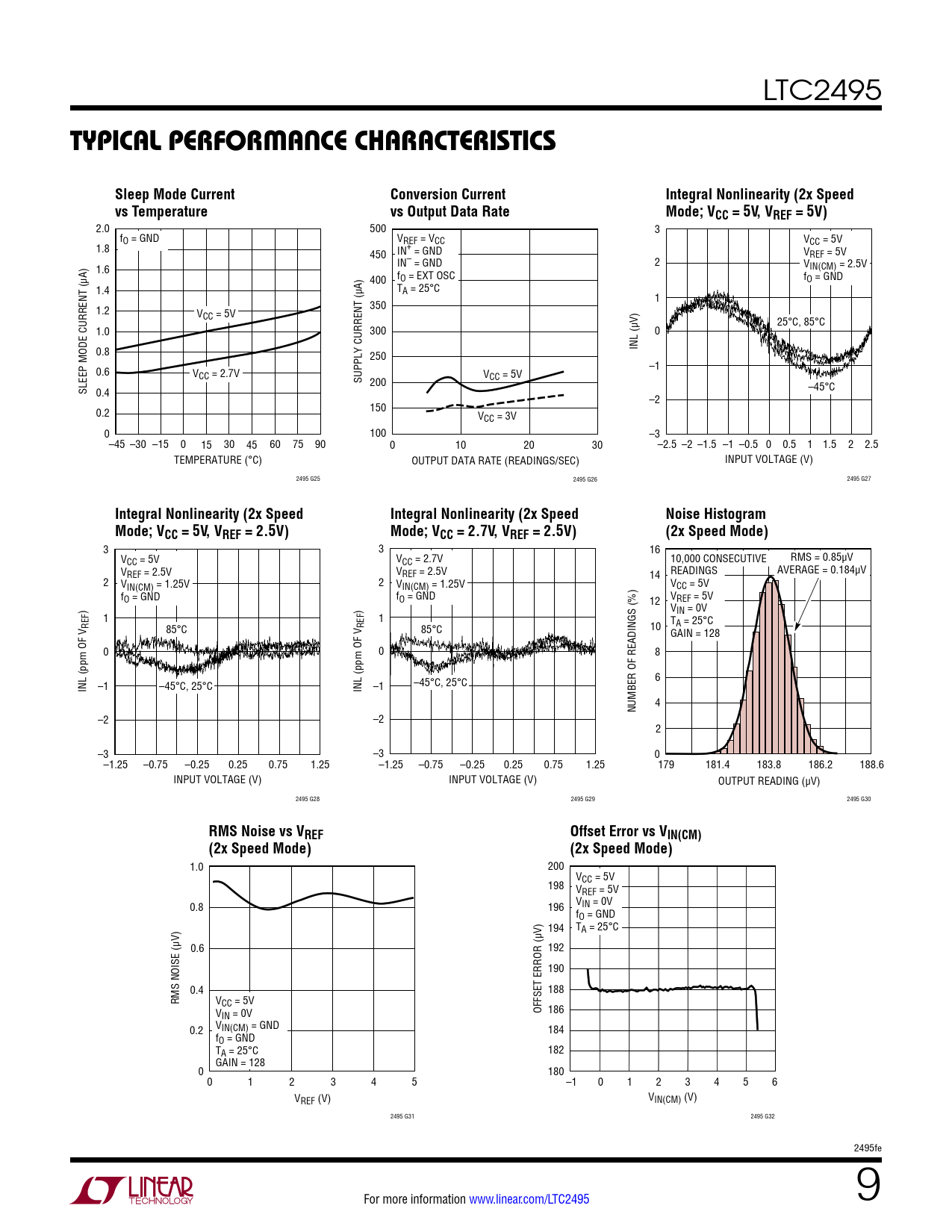 2.0 500 3 fO = GND VREF = VCC VCC = 5V 1.8 450 IN+ = GND VREF = 5V IN– = GND 2 1.6 VIN(CM) = 2.5V 400 fO = EXT OSC fO = GND 1.4 TA = 25°C 1 1.2 350 VCC = 5V 25°C, 85°C 1.0 300 0 0.8 INL (µV) 250 0.6 –1 VCC = 2.7V SUPPLY CURRENT (µA) V 200 CC = 5V SLEEP MODE CURRENT (µA) 0.4 –45°C –2 0.2 150 VCC = 3V 0 100 –3 –45 –30 –15 0 15 30 45 60 75 90 0 10 20 30 –2.5 –2 –1.5 –1 –0.5 0 0.5 1 1.5 2 2.5 TEMPERATURE (°C) OUTPUT DATA RATE (READINGS/SEC) INPUT VOLTAGE (V) 2495 G25 2495 G26 2495 G27