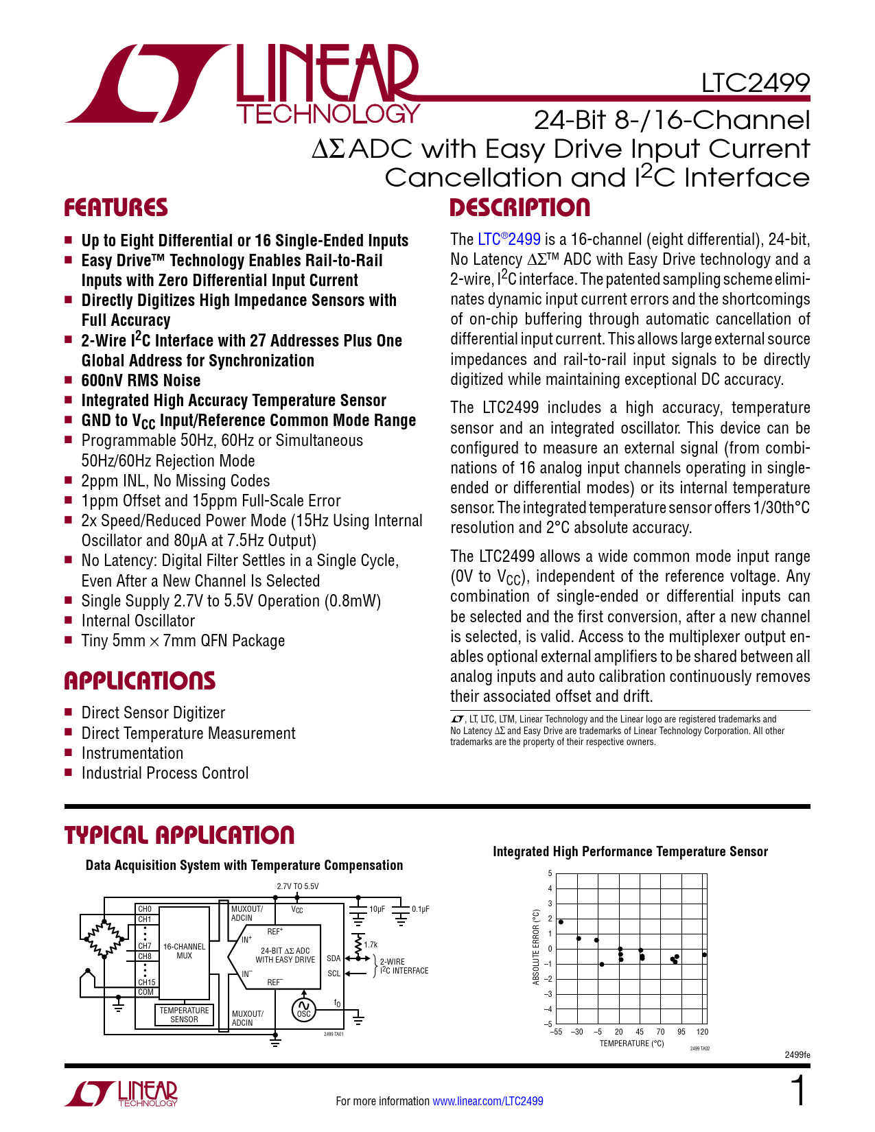 LTC2499 24-Bit 8-/16-Channel DS ADC with Easy Drive Input Current Cancellation and I2C Interface FeaturesDescription n Up to Eight Differential or 16 Single-Ended Inputs The LTC®2499 is a 16-channel (eight differential), 24-bit, n Easy Drive™ Technology Enables Rail-to-Rail No Latency DS™ ADC with Easy Drive technology and a Inputs with Zero Differential Input Current 2-wire, I2C interface. The patented sampling scheme elimi- n Directly Digitizes High Impedance Sensors with nates dynamic input current errors and the shortcomings Full Accuracy of on-chip buffering through automatic cancellation of n 2-Wire I2C Interface with 27 Addresses Plus One differential input current. This allows large external source Global Address for Synchronization impedances and rail-to-rail input signals to be directly n 600nV RMS Noise digitized while maintaining exceptional DC accuracy. n Integrated High Accuracy Temperature Sensor The LTC2499 includes a high accuracy, temperature n GND to VCC Input/Reference Common Mode Range sensor and an integrated oscillator. This device can be n Programmable 50Hz, 60Hz or Simultaneous configured to measure an external signal (from combi- 50Hz/60Hz Rejection Mode nations of 16 analog input channels operating in single- n 2ppm INL, No Missing Codes ended or differential modes) or its internal temperature n 1ppm Offset and 15ppm Full-Scale Error sensor. The integrated temperature sensor offers 1/30th°C n 2x Speed/Reduced Power Mode (15Hz Using Internal resolution and 2°C absolute accuracy. Oscillator and 80µA at 7.5Hz Output) n The LTC2499 allows a wide common mode input range No Latency: Digital Filter Settles in a Single Cycle, (0V to V Even After a New Channel Is Selected CC), independent of the reference voltage. Any n combination of single-ended or differential inputs can Single Supply 2.7V to 5.5V Operation (0.8mW) n be selected and the first conversion, after a new channel Internal Oscillator n is selected, is valid. Access to the multiplexer output en- Tiny 5mm × 7mm QFN Package ables optional external amplifiers to be shared between all applications analog inputs and auto calibration continuously removes their associated offset and drift. n Direct Sensor Digitizer L, LT, LTC, LTM, Linear Technology and the Linear logo are registered trademarks and n Direct Temperature Measurement No Latency ∆∑ and Easy Drive are trademarks of Linear Technology Corporation. All other trademarks are the property of their respective owners. n Instrumentation n Industrial Process Control typical applicationIntegrated High Performance Temperature SensorData Acquisition System with Temperature Compensation 5 2.7V TO 5.5V 4 3 CH0 MUXOUT/ VCC 10µF 0.1µF CH1 ADCIN 2 • REF+ • 1 • IN+ CH7 1.7k 16-CHANNEL 24-BIT ∆Σ ADC 0 CH8 MUX WITH EASY DRIVE SDA 2-WIRE • –1 • IN– SCL I2C INTERFACE • CH15 REF– ABSOLUTE ERROR (°C) –2 COM –3 fO TEMPERATURE MUXOUT/ –4 OSC SENSOR ADCIN –5 2499 TA01 –55 –30 –5 20 45 70 95 120 TEMPERATURE (°C) 2499 TA02 2499fe For more information www.linear.com/LTC2499 1 Document Outline Features Description Applications Typical Application Absolute Maximum Ratings Pin Configuration Order Information Electrical Characteristics (normal speed) Electrical Characteristics (2x Speed) Converter Characteristics Analog Input and Reference I2C Inputs And Digital Outputs Power Requirements Digital Inputs And Digital Outputs I2C Timing Characteristics Typical Performance Characteristics Pin Functions Functional Block Diagram Applications Information Package Description Revision History Related Parts