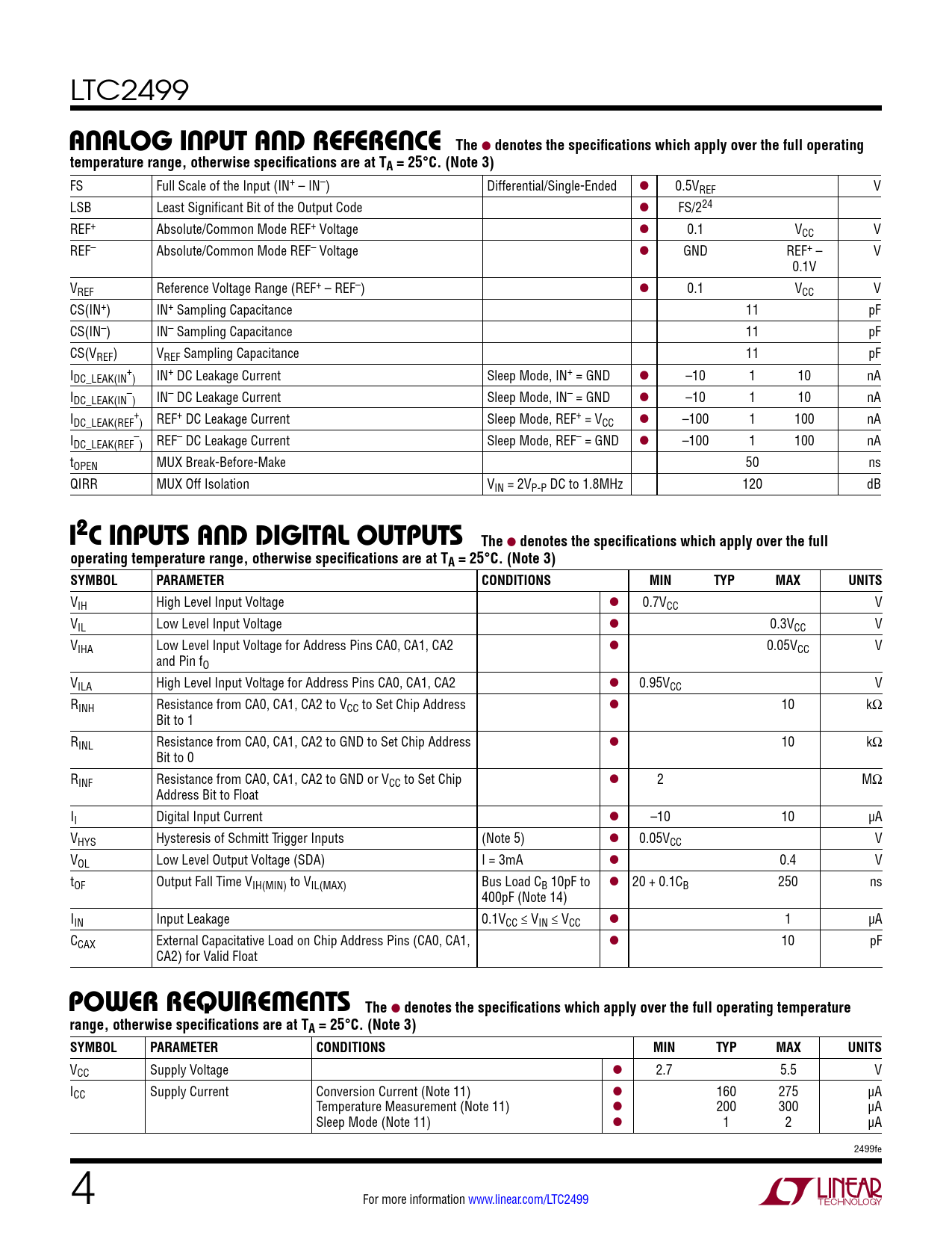 LTC2499 analog input anD reFerenceThe l denotes the specifications which apply over the full operatingtemperature range, otherwise specifications are at TA = 25°C. (Note 3) FS Full Scale of the Input (IN+ – IN–) Differential/Single-Ended l 0.5VREF V LSB Least Significant Bit of the Output Code l FS/224 REF+ Absolute/Common Mode REF+ Voltage l 0.1 VCC V REF– Absolute/Common Mode REF– Voltage l GND REF+ – V 0.1V VREF Reference Voltage Range (REF+ – REF–) l 0.1 VCC V CS(IN+) IN+ Sampling Capacitance 11 pF CS(IN–) IN– Sampling Capacitance 11 pF CS(VREF) VREF Sampling Capacitance 11 pF I + DC_LEAK(IN ) IN+ DC Leakage Current Sleep Mode, IN+ = GND l –10 1 10 nA I – DC_LEAK(IN ) IN– DC Leakage Current Sleep Mode, IN– = GND l –10 1 10 nA I + DC_LEAK(REF ) REF+ DC Leakage Current Sleep Mode, REF+ = VCC l –100 1 100 nA I – DC_LEAK(REF ) REF– DC Leakage Current Sleep Mode, REF– = GND l –100 1 100 nA tOPEN MUX Break-Before-Make 50 ns QIRR MUX Off Isolation VIN = 2VP-P DC to 1.8MHz 120 dB i2c inputs anD Digital outputsThe l denotes the specifications which apply over the fulloperating temperature range, otherwise specifications are at TA = 25°C. (Note 3) SYMBOLPARAMETERCONDITIONSMINTYPMAXUNITS VIH High Level Input Voltage l 0.7VCC V VIL Low Level Input Voltage l 0.3VCC V VIHA Low Level Input Voltage for Address Pins CA0, CA1, CA2 l 0.05VCC V and Pin fO VILA High Level Input Voltage for Address Pins CA0, CA1, CA2 l 0.95VCC V RINH Resistance from CA0, CA1, CA2 to VCC to Set Chip Address l 10 kΩ Bit to 1 RINL Resistance from CA0, CA1, CA2 to GND to Set Chip Address l 10 kΩ Bit to 0 RINF Resistance from CA0, CA1, CA2 to GND or VCC to Set Chip l 2 MΩ Address Bit to Float II Digital Input Current l –10 10 µA VHYS Hysteresis of Schmitt Trigger Inputs (Note 5) l 0.05VCC V VOL Low Level Output Voltage (SDA) I = 3mA l 0.4 V tOF Output Fall Time VIH(MIN) to VIL(MAX) Bus Load CB 10pF to l 20 + 0.1CB 250 ns 400pF (Note 14) IIN Input Leakage 0.1VCC ≤ VIN ≤ VCC l 1 µA CCAX External Capacitative Load on Chip Address Pins (CA0, CA1, l 10 pF CA2) for Valid Float power requireMentsThe l denotes the specifications which apply over the full operating temperaturerange, otherwise specifications are at TA = 25°C. (Note 3) SYMBOLPARAMETERCONDITIONSMINTYPMAXUNITS VCC Supply Voltage l 2.7 5.5 V ICC Supply Current Conversion Current (Note 11) l 160 275 µA Temperature Measurement (Note 11) l 200 300 µA Sleep Mode (Note 11) l 1 2 µA 2499fe 4 For more information www.linear.com/LTC2499 Document Outline Features Description Applications Typical Application Absolute Maximum Ratings Pin Configuration Order Information Electrical Characteristics (normal speed) Electrical Characteristics (2x Speed) Converter Characteristics Analog Input and Reference I2C Inputs And Digital Outputs Power Requirements Digital Inputs And Digital Outputs I2C Timing Characteristics Typical Performance Characteristics Pin Functions Functional Block Diagram Applications Information Package Description Revision History Related Parts