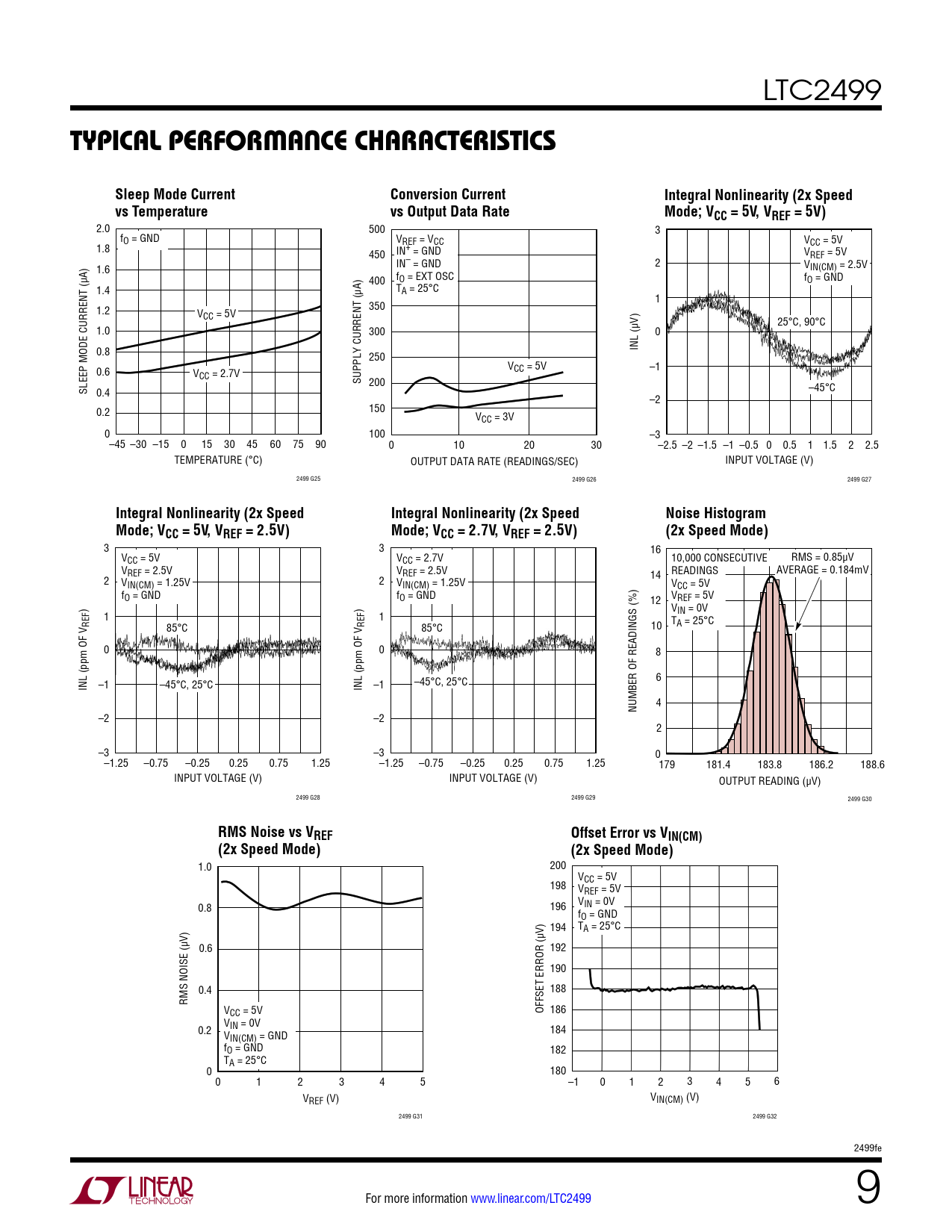 2.0 500 3 fO = GND VREF = VCC V 1.8 CC = 5V IN+ = GND V 450 REF = 5V IN– = GND 2 1.6 VIN(CM) = 2.5V fO = EXT OSC f 400 O = GND 1.4 TA = 25°C 1 1.2 350 VCC = 5V 25°C, 90°C 1.0 300 0 0.8 INL (µV) 250 0.6 V V CC = 5V –1 CC = 2.7V SUPPLY CURRENT (µA) 200 SLEEP MODE CURRENT (µA) 0.4 –45°C –2 0.2 150 VCC = 3V 0 100 –3 –45 –30 –15 0 15 30 45 60 75 90 0 10 20 30 –2.5 –2 –1.5 –1 –0.5 0 0.5 1 1.5 2 2.5 TEMPERATURE (°C) OUTPUT DATA RATE (READINGS/SEC) INPUT VOLTAGE (V) 2499 G25 2499 G26 2499 G27