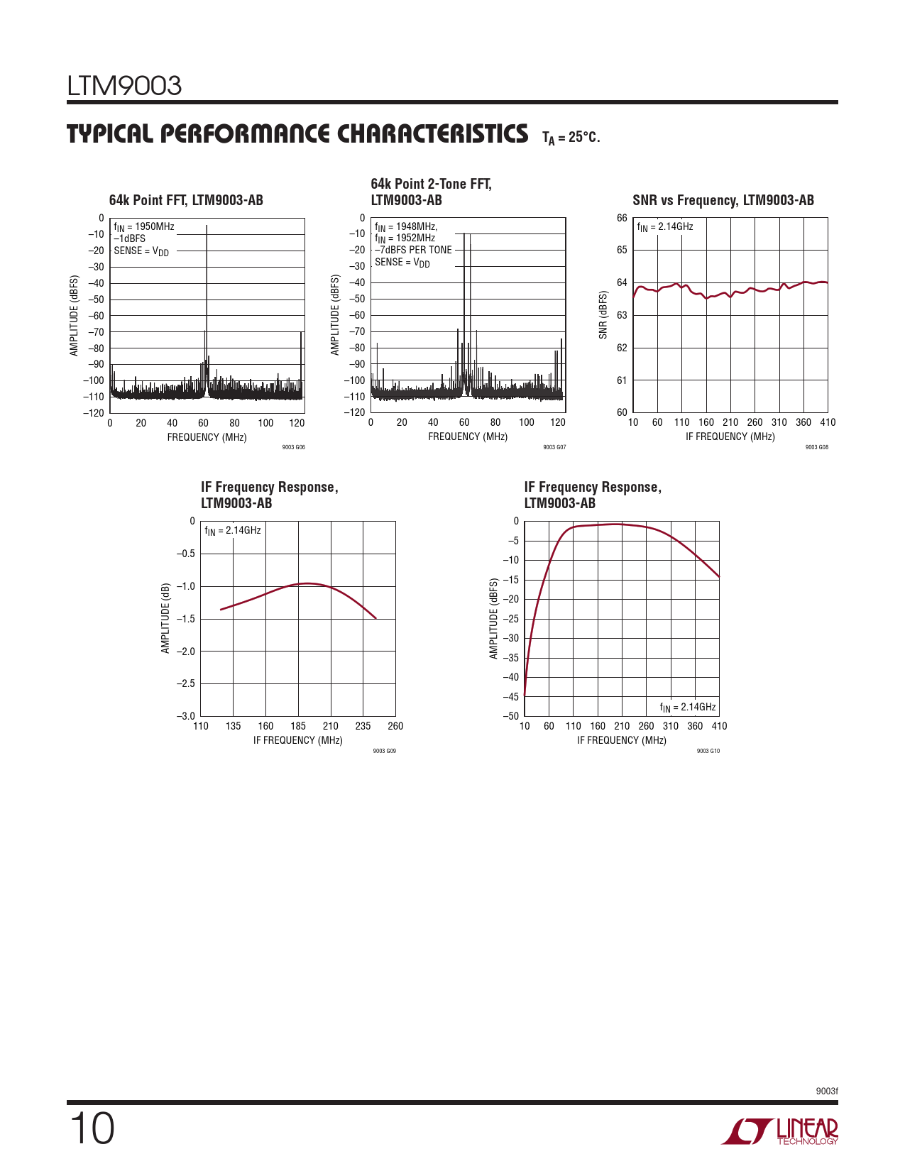 TA = 25°C. 64k Point 2-Tone FFT,. 64k Point FFT, LTM9003-AB. LTM9003-AB. SNR vs Frequency, LTM9003-AB. IF Frequency Response,