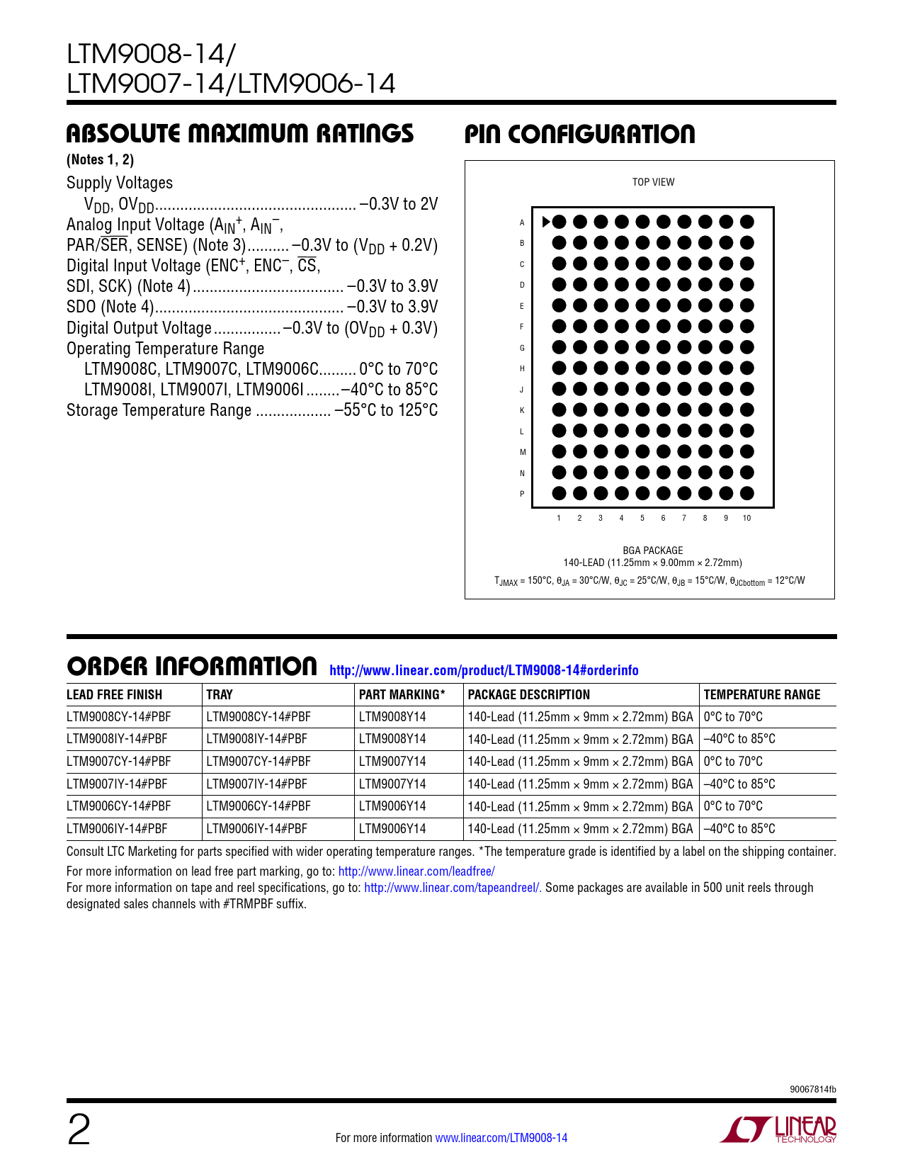 LTM9008-14/ LTM9007-14/LTM9006-14 ABSOLUTE MAXIMUM RATINGSPIN CONFIGURATION(Notes 1, 2) Supply Voltages TOP VIEW VDD, OVDD .. –0.3V to 2V Analog Input Voltage (A + – IN , AIN , A PAR/SER, SENSE) (Note 3) .. –0.3V to (VDD + 0.2V) B Digital Input Voltage (ENC+, ENC–, CS, C SDI, SCK) (Note 4) .. –0.3V to 3.9V D SDO (Note 4) ... –0.3V to 3.9V E Digital Output Voltage .. –0.3V to (OVDD + 0.3V) F Operating Temperature Range G LTM9008C, LTM9007C, LTM9006C... 0°C to 70°C H LTM9008I, LTM9007I, LTM9006I ..–40°C to 85°C J Storage Temperature Range .. –55°C to 125°C K L M N P 1 2 3 4 5 6 7 8 9 10 BGA PACKAGE 140-LEAD (11.25mm × 9.00mm × 2.72mm) TJMAX = 150°C, θJA = 30°C/W, θJC = 25°C/W, θJB = 15°C/W, θJCbottom = 12°C/W ORDER INFORMATION http://www.linear.com/product/LTM9008-14#orderinfoLEAD FREE FINISHTRAYPART MARKING*PACKAGE DESCRIPTIONTEMPERATURE RANGE LTM9008CY-14#PBF LTM9008CY-14#PBF LTM9008Y14 140-Lead (11.25mm × 9mm × 2.72mm) BGA 0°C to 70°C LTM9008IY-14#PBF LTM9008IY-14#PBF LTM9008Y14 140-Lead (11.25mm × 9mm × 2.72mm) BGA –40°C to 85°C LTM9007CY-14#PBF LTM9007CY-14#PBF LTM9007Y14 140-Lead (11.25mm × 9mm × 2.72mm) BGA 0°C to 70°C LTM9007IY-14#PBF LTM9007IY-14#PBF LTM9007Y14 140-Lead (11.25mm × 9mm × 2.72mm) BGA –40°C to 85°C LTM9006CY-14#PBF LTM9006CY-14#PBF LTM9006Y14 140-Lead (11.25mm × 9mm × 2.72mm) BGA 0°C to 70°C LTM9006IY-14#PBF LTM9006IY-14#PBF LTM9006Y14 140-Lead (11.25mm × 9mm × 2.72mm) BGA –40°C to 85°C Consult LTC Marketing for parts specified with wider operating temperature ranges. *The temperature grade is identified by a label on the shipping container. For more information on lead free part marking, go to: http://www.linear.com/leadfree/ For more information on tape and reel specifications, go to: http://www.linear.com/tapeandreel/. Some packages are available in 500 unit reels through designated sales channels with #TRMPBF suffix. 90067814fb 2 For more information www.linear.com/LTM9008-14 Document Outline Features Description Applications Typical Application Absolute Maximum Ratings Pin Configuration Order Information Converter Characteristics Analog Input Dynamic Accuracy Internal Reference Characteristics Digital Inputs And Outputs Power Requirements Timing Characteristics Timing Diagrams Typical Performance Characteristics Pin Functions Pin Configuration Table Functional Block Diagram Applications Information Package Description Related Parts