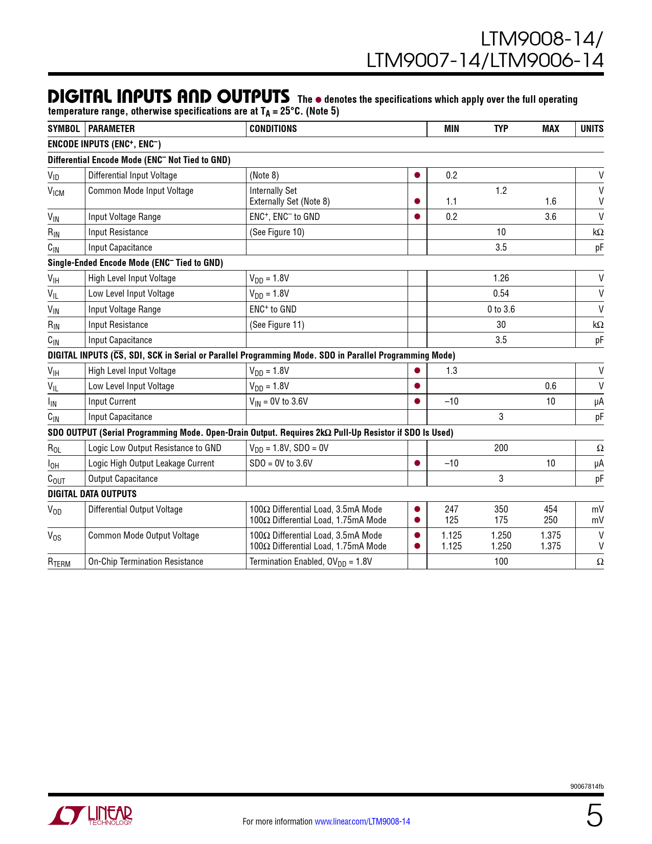 VOD Differential Output Voltage 100Ω Differential Load, 3.5mA Mode l 247 350 454 mV 100Ω Differential Load, 1.75mA Mode l 125 175 250 mV VOS Common Mode Output Voltage 100Ω Differential Load, 3.5mA Mode l 1.125 1.250 1.375 V 100Ω Differential Load, 1.75mA Mode l 1.125 1.250 1.375 V RTERM On-Chip Termination Resistance Termination Enabled, OVDD = 1.8V 100 Ω 90067814fb For more information www.linear.com/LTM9008-14 5 Document Outline Features Description Applications Typical Application Absolute Maximum Ratings Pin Configuration Order Information Converter Characteristics Analog Input Dynamic Accuracy Internal Reference Characteristics Digital Inputs And Outputs Power Requirements Timing Characteristics Timing Diagrams Typical Performance Characteristics Pin Functions Pin Configuration Table Functional Block Diagram Applications Information Package Description Related Parts