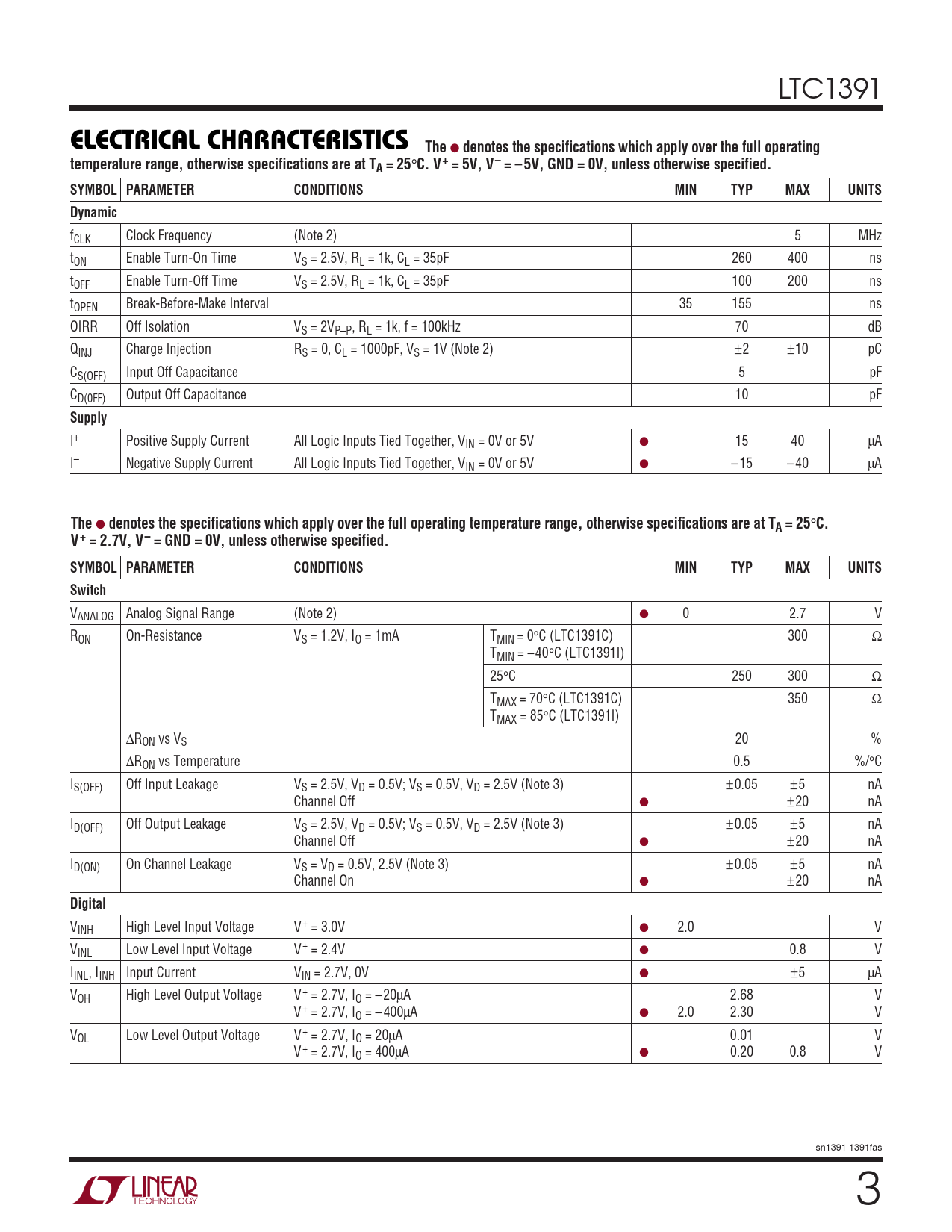 VINH High Level Input Voltage V+ = 3.0V ● 2.0 V VINL Low Level Input Voltage V+ = 2.4V ● 0.8 V IINL, IINH Input Current VIN = 2.7V, 0V ● ±5 µA VOH High Level Output Voltage V+ = 2.7V, IO = – 20µA 2.68 V V+ = 2.7V, IO = – 400µA ● 2.0 2.30 V VOL Low Level Output Voltage V+ = 2.7V, IO = 20µA 0.01 V V+ = 2.7V, IO = 400µA ● 0.20 0.8 V sn1391 1391fas 3