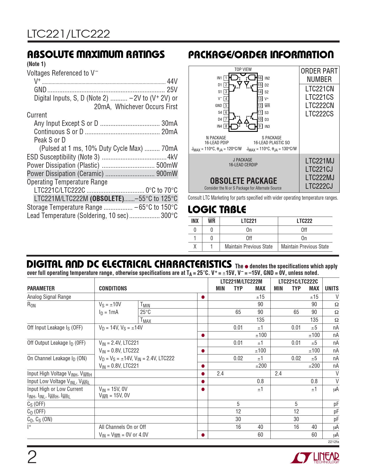 ABSOLUTE AXI U RATI GS. PACKAGE/ORDER I FOR ATIO. (Note 1). OBSOLETE PACKAGE. (OBSOLETE). LOGIC TABLE. INX. LTC221. LTC222