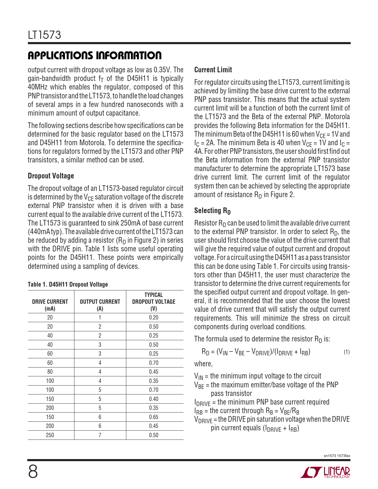 value of drive current that will satisfy the output current 20 1 0.20 requirements. This will minimize the stress on circuit 20 2 0.50 components during overload conditions. 40 2 0.25 The formula used to determine the resistor RD is: 40 3 0.50 R 60 3 0.25 D = (VIN – VBE – VDRIVE)/(IDRIVE + IRB) (1) 60 4 0.70 where, 80 4 0.45 VIN = the minimum input voltage to the circuit 100 4 0.35 VBE = the maximum emitter/base voltage of the PNP 100 5 0.70 pass transistor 150 5 0.40 IDRIVE = the minimum PNP base current required 200 5 0.35 IRB = the current through RB = VBE/RB 150 6 0.65 VDRIVE = the DRIVE pin saturation voltage when the DRIVE 200 6 0.45 pin current equals (IDRIVE + IRB) 250 7 0.50 sn1573 1573fas 8