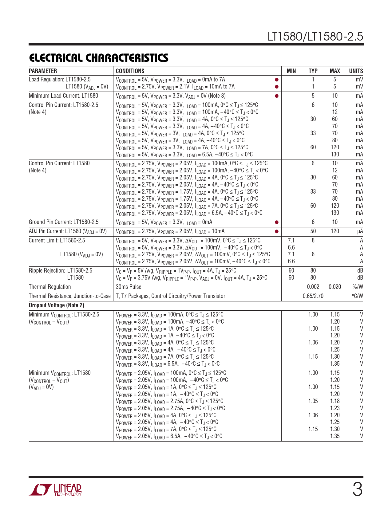 Load Regulation: LT1580-2.5 VCONTROL = 5V, VPOWER = 3.3V, ILOAD = 0mA to 7A ● 1 5 mV LT1580 (VADJ = 0V) VCONTROL = 2.75V, VPOWER = 2.1V, ILOAD = 10mA to 7A ● 1 5 mV Minimum Load Current: LT1580 VCONTROL = 5V, VPOWER = 3.3V, VADJ = 0V (Note 3) ● 5 10 mA Control Pin Current: LT1580-2.5 VCONTROL = 5V, VPOWER = 3.3V, ILOAD = 100mA, 0°C ≤ TJ ≤ 125°C 6 10 mA (Note 4) VCONTROL = 5V, VPOWER = 3.3V, ILOAD = 100mA, – 40°C ≤ TJ < 0°C 12 mA VCONTROL = 5V, VPOWER = 3.3V, ILOAD = 4A, 0°C ≤ TJ ≤ 125°C 30 60 mA VCONTROL = 5V, VPOWER = 3.3V, ILOAD = 4A, – 40°C ≤ TJ < 0°C 70 mA VCONTROL = 5V, VPOWER = 3V, ILOAD = 4A, 0°C ≤ TJ ≤ 125°C 33 70 mA VCONTROL = 5V, VPOWER = 3V, ILOAD = 4A, – 40°C ≤ TJ < 0°C 80 mA VCONTROL = 5V, VPOWER = 3.3V, ILOAD = 7A, 0°C ≤ TJ ≤ 125°C 60 120 mA VCONTROL = 5V, VPOWER = 3.3V, ILOAD = 6.5A, – 40°C ≤ TJ < 0°C 130 mA Control Pin Current: LT1580 VCONTROL = 2.75V, VPOWER = 2.05V, ILOAD = 100mA, 0°C ≤ TJ ≤ 125°C 6 10 mA (Note 4) VCONTROL = 2.75V, VPOWER = 2.05V, ILOAD = 100mA, – 40°C ≤ TJ < 0°C 12 mA VCONTROL = 2.75V, VPOWER = 2.05V, ILOAD = 4A, 0°C ≤ TJ ≤ 125°C 30 60 mA VCONTROL = 2.75V, VPOWER = 2.05V, ILOAD = 4A, – 40°C ≤ TJ < 0°C 70 mA VCONTROL = 2.75V, VPOWER = 1.75V, ILOAD = 4A, 0°C ≤ TJ ≤ 125°C 33 70 mA VCONTROL = 2.75V, VPOWER = 1.75V, ILOAD = 4A, – 40°C ≤ TJ < 0°C 80 mA VCONTROL = 2.75V, VPOWER = 2.05V, ILOAD = 7A, 0°C ≤ TJ ≤ 125°C 60 120 mA VCONTROL = 2.75V, VPOWER = 2.05V, ILOAD = 6.5A, – 40°C ≤ TJ < 0°C 130 mA Ground Pin Current: LT1580-2.5 VCONTROL = 5V, VPOWER = 3.3V, ILOAD = 0mA ● 6 10 mA ADJ Pin Current: LT1580 (VADJ = 0V) VCONTROL = 2.75V, VPOWER = 2.05V, ILOAD = 10mA ● 50 120 µA Current Limit: LT1580-2.5 VCONTROL = 5V, VPOWER = 3.3V, ∆VOUT = 100mV, 0°C ≤ TJ ≤ 125°C 7.1 8 A VCONTROL = 5V, VPOWER = 3.3V, ∆VOUT = 100mV, – 40°C ≤ TJ < 0°C 6.6 A LT1580 (VADJ = 0V) VCONTROL = 2.75V, VPOWER = 2.05V, ∆VOUT = 100mV, 0°C ≤ TJ ≤ 125°C 7.1 8 A VCONTROL = 2.75V, VPOWER = 2.05V, ∆VOUT = 100mV, – 40°C ≤ TJ < 0°C 6.6 A Ripple Rejection: LT1580-2.5 VC = VP = 5V Avg, VRIPPLE = 1VP-P, IOUT = 4A, TJ = 25°C 60 80 dB LT1580 VC = VP = 3.75V Avg, VRIPPLE = 1VP-P, VADJ = 0V, IOUT = 4A, TJ = 25°C 60 80 dB Thermal Regulation 30ms Pulse 0.002 0.020 %/W Thermal Resistance, Junction-to-Case T, T7 Packages, Control Circuitry/Power Transistor 0.65/2.70 °C/W