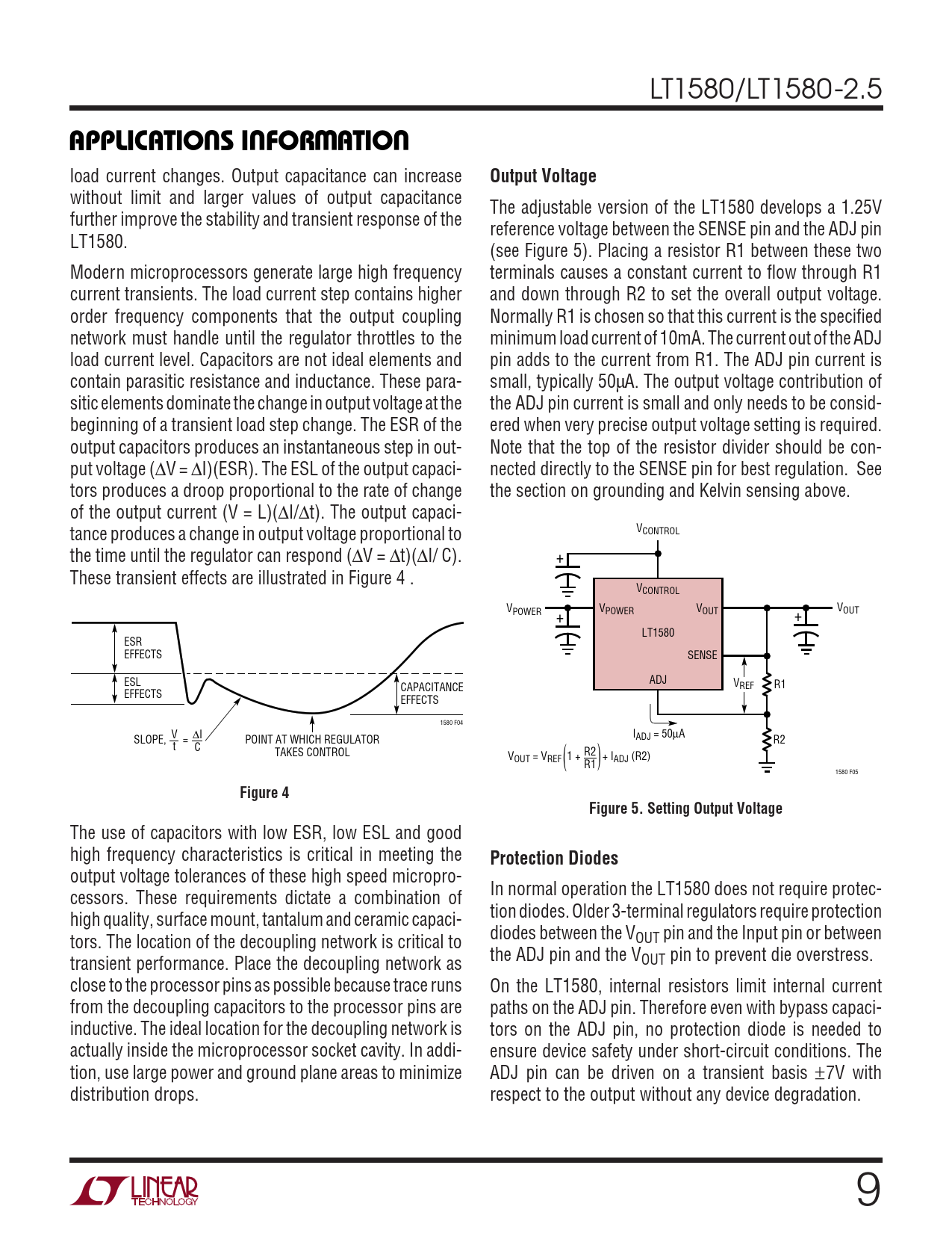 output voltage tolerances of these high speed micropro- In normal operation the LT1580 does not require protec- cessors. These requirements dictate a combination of tion diodes. Older 3-terminal regulators require protection high quality, surface mount, tantalum and ceramic capaci- diodes between the V tors. The location of the decoupling network is critical to OUT pin and the Input pin or between the ADJ pin and the V transient performance. Place the decoupling network as OUT pin to prevent die overstress. close to the processor pins as possible because trace runs On the LT1580, internal resistors limit internal current from the decoupling capacitors to the processor pins are paths on the ADJ pin. Therefore even with bypass capaci- inductive. The ideal location for the decoupling network is tors on the ADJ pin, no protection diode is needed to actually inside the microprocessor socket cavity. In addi- ensure device safety under short-circuit conditions. The tion, use large power and ground plane areas to minimize ADJ pin can be driven on a transient basis ±7V with distribution drops. respect to the output without any device degradation. 9