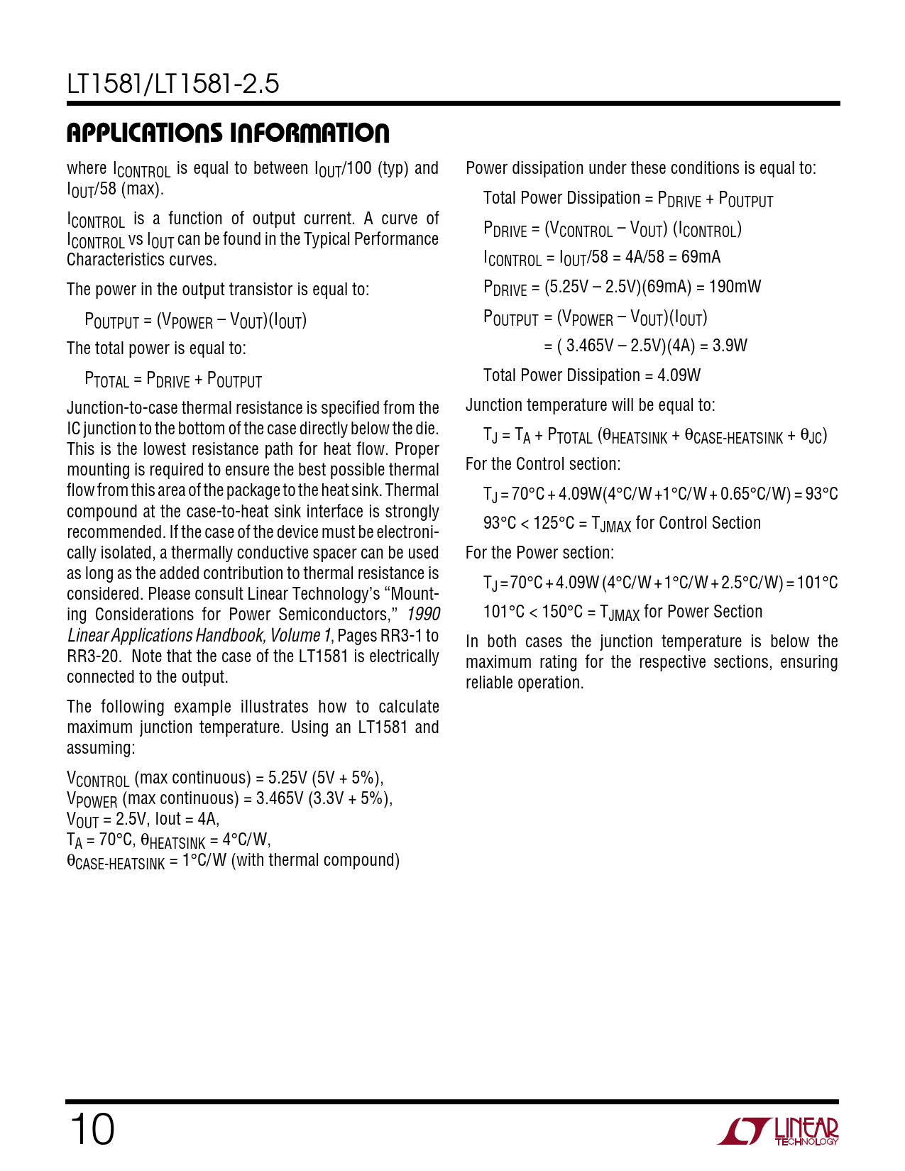 LT1581/LT1581-2.5 UUWUAPPLICATIONS INFORMATION where ICONTROL is equal to between IOUT/100 (typ) and Power dissipation under these conditions is equal to: IOUT/58 (max). Total Power Dissipation = PDRIVE + POUTPUT ICONTROL is a function of output current. A curve of P I DRIVE = (VCONTROL – VOUT) (ICONTROL) CONTROL vs IOUT can be found in the Typical Performance Characteristics curves. ICONTROL = IOUT/58 = 4A/58 = 69mA The power in the output transistor is equal to: PDRIVE = (5.25V – 2.5V)(69mA) = 190mW P P OUTPUT = (VPOWER – VOUT)(IOUT) OUTPUT = (VPOWER – VOUT)(IOUT) The total power is equal to: = ( 3.465V – 2.5V)(4A) = 3.9W P Total Power Dissipation = 4.09W TOTAL = PDRIVE + POUTPUT Junction-to-case thermal resistance is specified from the Junction temperature will be equal to: IC junction to the bottom of the case directly below the die. TJ = TA + PTOTAL (θHEATSINK + θCASE-HEATSINK + θJC) This is the lowest resistance path for heat flow. Proper mounting is required to ensure the best possible thermal For the Control section: flow from this area of the package to the heat sink. Thermal TJ = 70°C + 4.09W(4°C/W + 1°C/W + 0.65°C/W) = 93°C compound at the case-to-heat sink interface is strongly 93°C < 125°C = T recommended. If the case of the device must be electroni- JMAX for Control Section cally isolated, a thermally conductive spacer can be used For the Power section: as long as the added contribution to thermal resistance is T considered. Please consult Linear Technology’s “Mount- J = 70°C + 4.09W (4°C/ W + 1°C/ W + 2.5°C/ W) = 101°C ing Considerations for Power Semiconductors,” 1990 101°C < 150°C = TJMAX for Power Section Linear Applications Handbook, Volume 1, Pages RR3-1 to In both cases the junction temperature is below the RR3-20. Note that the case of the LT1581 is electrically maximum rating for the respective sections, ensuring connected to the output. reliable operation. The following example illustrates how to calculate maximum junction temperature. Using an LT1581 and assuming: VCONTROL (max continuous) = 5.25V (5V + 5%), VPOWER (max continuous) = 3.465V (3.3V + 5%), VOUT = 2.5V, Iout = 4A, TA = 70°C, θHEATSINK = 4°C/W, θCASE-HEATSINK = 1°C/W (with thermal compound) 10