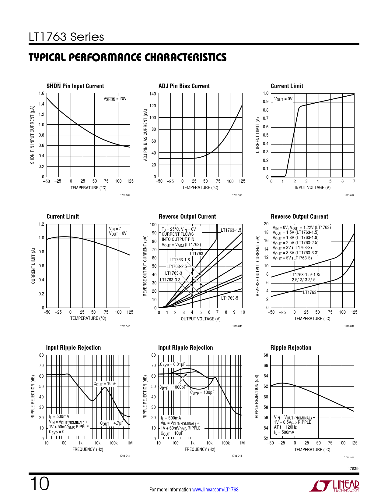 1.6 140 1.0 VSHDN = 20V VOUT = 0V 1.4 0.9 120 0.8 1.2 100 0.7 1.0 80 0.6 0.8 0.5 60 0.6 0.4 PIN INPUT CURRENT (µA) CURRENT LIMIT (A) 0.3 0.4 40 ADJ PIN BIAS CURRENT (nA) SHDN 0.2 0.2 20 0.1 0 0 0 –50 –25 0 25 50 75 100 125 –50 –25 0 25 50 75 100 125 0 1 2 3 4 5 6 7 TEMPERATURE (°C) TEMPERATURE (°C) INPUT VOLTAGE (V) 1763 G37 1763 G38 1763 G39