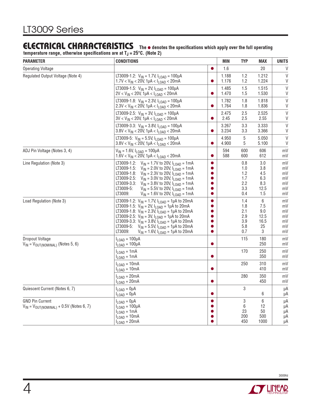 Operating Voltage l 1.6 20 V Regulated Output Voltage (Note 4) LT3009-1.2: VIN = 1.7V, ILOAD = 100μA 1.188 1.2 1.212 V 1.7V < VIN < 20V, 1μA < ILOAD < 20mA l 1.176 1.2 1.224 V LT3009-1.5: VIN = 2V, ILOAD = 100μA 1.485 1.5 1.515 V 2V < VIN < 20V, 1μA < ILOAD < 20mA l 1.470 1.5 1.530 V LT3009-1.8: VIN = 2.3V, ILOAD = 100μA 1.782 1.8 1.818 V 2.3V < VIN < 20V, 1μA < ILOAD < 20mA l 1.764 1.8 1.836 V LT3009-2.5: VIN = 3V, ILOAD = 100μA 2.475 2.5 2.525 V 3V < VIN < 20V, 1μA < ILOAD < 20mA l 2.45 2.5 2.55 V LT3009-3.3: VIN = 3.8V, ILOAD = 100μA 3.267 3.3 3.333 V 3.8V < VIN < 20V, 1μA < ILOAD < 20mA l 3.234 3.3 3.366 V LT3009-5: VIN = 5.5V, ILOAD = 100μA 4.950 5 5.050 V 3.8V < VIN < 20V, 1μA < ILOAD < 20mA l 4.900 5 5.100 V ADJ Pin Voltage (Notes 3, 4) VIN = 1.6V, ILOAD = 100μA 594 600 606 mV 1.6V < VIN < 20V, 1μA < ILOAD < 20mA l 588 600 612 mV Line Regulation (Note 3) LT3009-1.2: VIN = 1.7V to 20V, ILOAD = 1mA l 0.8 3.0 mV LT3009-1.5: VIN = 2.0V to 20V, ILOAD = 1mA l 1.0 3.8 mV LT3009-1.8: VIN = 2.3V to 20V, ILOAD = 1mA l 1.2 4.5 mV LT3009-2.5: VIN = 3.0V to 20V, ILOAD = 1mA l 1.7 6.3 mV LT3009-3.3: VIN = 3.8V to 20V, ILOAD = 1mA l 2.2 8.3 mV LT3009-5: VIN = 5.5V to 20V, ILOAD = 1mA l 3.3 12.5 mV LT3009: VIN = 1.6V to 20V, ILOAD = 1mA l 0.4 1.5 mV Load Regulation (Note 3) LT3009-1.2: VIN = 1.7V, ILOAD = 1μA to 20mA l 1.4 6 mV LT3009-1.5: VIN = 2V, ILOAD = 1μA to 20mA l 1.8 7.5 mV LT3009-1.8: VIN = 2.3V, ILOAD = 1μA to 20mA l 2.1 9.0 mV LT3009-2.5: VIN = 3V, ILOAD = 1μA to 20mA l 2.9 12.5 mV LT3009-3.3: VIN = 3.8V, ILOAD = 1μA to 20mA l 3.9 16.5 mV LT3009-5: VIN = 5.5V, ILOAD = 1μA to 20mA l 5.8 25 mV LT3009: VIN = 1.6V, ILOAD = 1μA to 20mA l 0.7 3 mV Dropout Voltage ILOAD = 100μA 115 180 mV VIN = VOUT(NOMINAL) (Notes 5, 6) ILOAD = 100μA l 250 mV ILOAD = 1mA 170 250 mV ILOAD = 1mA l 350 mV ILOAD = 10mA 250 310 mV ILOAD = 10mA l 410 mV ILOAD = 20mA 280 350 mV ILOAD = 20mA l 450 mV Quiescent Current (Notes 6, 7) ILOAD = 0μA 3 μA ILOAD = 0μA l 6 μA GND Pin Current ILOAD = 0μA l 3 6 μA VIN = VOUT(NOMINAL) + 0.5V (Notes 6, 7) ILOAD = 100μA l 6 12 μA ILOAD = 1mA l 23 50 μA ILOAD = 10mA l 200 500 μA ILOAD = 20mA l 450 1000 μA 3009fd 4