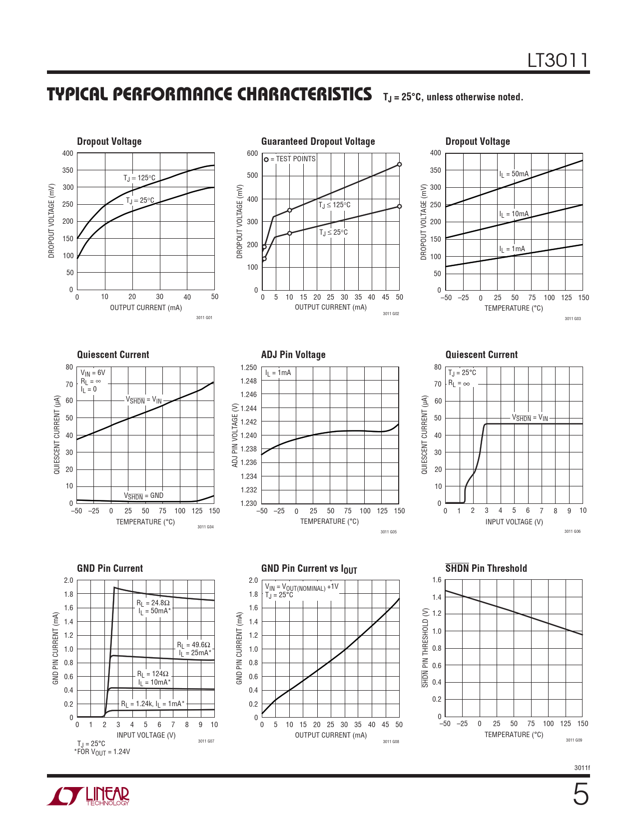 400 600 400 = TEST POINTS 350 350 500 I T L = 50mA J 125oC 300 300 T 400 250 J 25oC TJ b 125oC 250 TAGE (mV) TAGE (mV) IL = 10mA 200 300 200 TJ b 25oC 150 150 200 IL = 1mA DROPOUT VOL 100 DROPOUT VOL DROPOUT VOLTAGE (mV) 100 100 50 50 0 0 0 0 10 20 30 40 50 0 5 10 15 20 25 30 35 40 45 50 –50 –25 0 25 50 75 100 125 150 OUTPUT CURRENT (mA) OUTPUT CURRENT (mA) TEMPERATURE (°C) 3011 G02 3011 G01 3011 G03