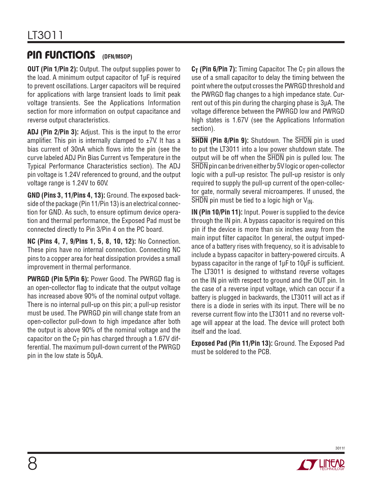 LT3011 PIN FUNCTIONS (DFN/MSOP)OUT (Pin 1/Pin 2): Output. The output supplies power to CT (Pin 6/Pin 7): Timing Capacitor. The CT pin allows the the load. A minimum output capacitor of 1μF is required use of a small capacitor to delay the timing between the to prevent oscillations. Larger capacitors will be required point where the output crosses the PWRGD threshold and for applications with large transient loads to limit peak the PWRGD fl ag changes to a high impedance state. Cur- voltage transients. See the Applications Information rent out of this pin during the charging phase is 3μA. The section for more information on output capacitance and voltage difference between the PWRGD low and PWRGD reverse output characteristics. high states is 1.67V (see the Applications Information section). ADJ (Pin 2/Pin 3): Adjust. This is the input to the error amplifi er. This pin is internally clamped to ±7V. It has a SHDN (Pin 8/Pin 9): Shutdown. The SHDN pin is used bias current of 30nA which fl ows into the pin (see the to put the LT3011 into a low power shutdown state. The curve labeled ADJ Pin Bias Current vs Temperature in the output will be off when the SHDN pin is pulled low. The Typical Performance Characteristics section). The ADJ SHDN pin can be driven either by 5V logic or open-collector pin voltage is 1.24V referenced to ground, and the output logic with a pull-up resistor. The pull-up resistor is only voltage range is 1.24V to 60V. required to supply the pull-up current of the open-collec- tor gate, normally several microamperes. If unused, the GND (Pins 3, 11/Pins 4, 13): Ground. The exposed back- SHDN pin must be tied to a logic high or V side of the package (Pin 11/Pin 13) is an electrical connec- IN. tion for GND. As such, to ensure optimum device opera- IN (Pin 10/Pin 11): Input. Power is supplied to the device tion and thermal performance, the Exposed Pad must be through the IN pin. A bypass capacitor is required on this connected directly to Pin 3/Pin 4 on the PC board. pin if the device is more than six inches away from the main input fi lter capacitor. In general, the output imped- NC (Pins 4, 7, 9/Pins 1, 5, 8, 10, 12): No Connection. ance of a battery rises with frequency, so it is advisable to These pins have no internal connection. Connecting NC include a bypass capacitor in battery-powered circuits. A pins to a copper area for heat dissipation provides a small bypass capacitor in the range of 1μF to 10μF is suffi cient. improvement in thermal performance. The LT3011 is designed to withstand reverse voltages PWRGD (Pin 5/Pin 6): Power Good. The PWRGD fl ag is on the IN pin with respect to ground and the OUT pin. In an open-collector fl ag to indicate that the output voltage the case of a reverse input voltage, which can occur if a has increased above 90% of the nominal output voltage. battery is plugged in backwards, the LT3011 will act as if There is no internal pull-up on this pin; a pull-up resistor there is a diode in series with its input. There will be no must be used. The PWRGD pin will change state from an reverse current fl ow into the LT3011 and no reverse volt- open-collector pull-down to high impedance after both age will appear at the load. The device will protect both the output is above 90% of the nominal voltage and the itself and the load. capacitor on the CT pin has charged through a 1.67V dif- Exposed Pad (Pin 11/Pin 13): Ground. The Exposed Pad ferential. The maximum pull-down current of the PWRGD must be soldered to the PCB. pin in the low state is 50μA. 3011f 8