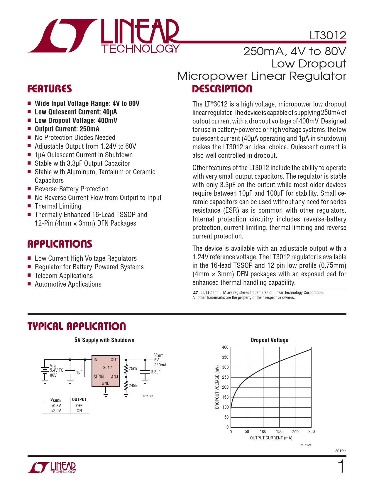 LT3012 250mA, 4V to 80V Low Dropout Micropower Linear Regulator