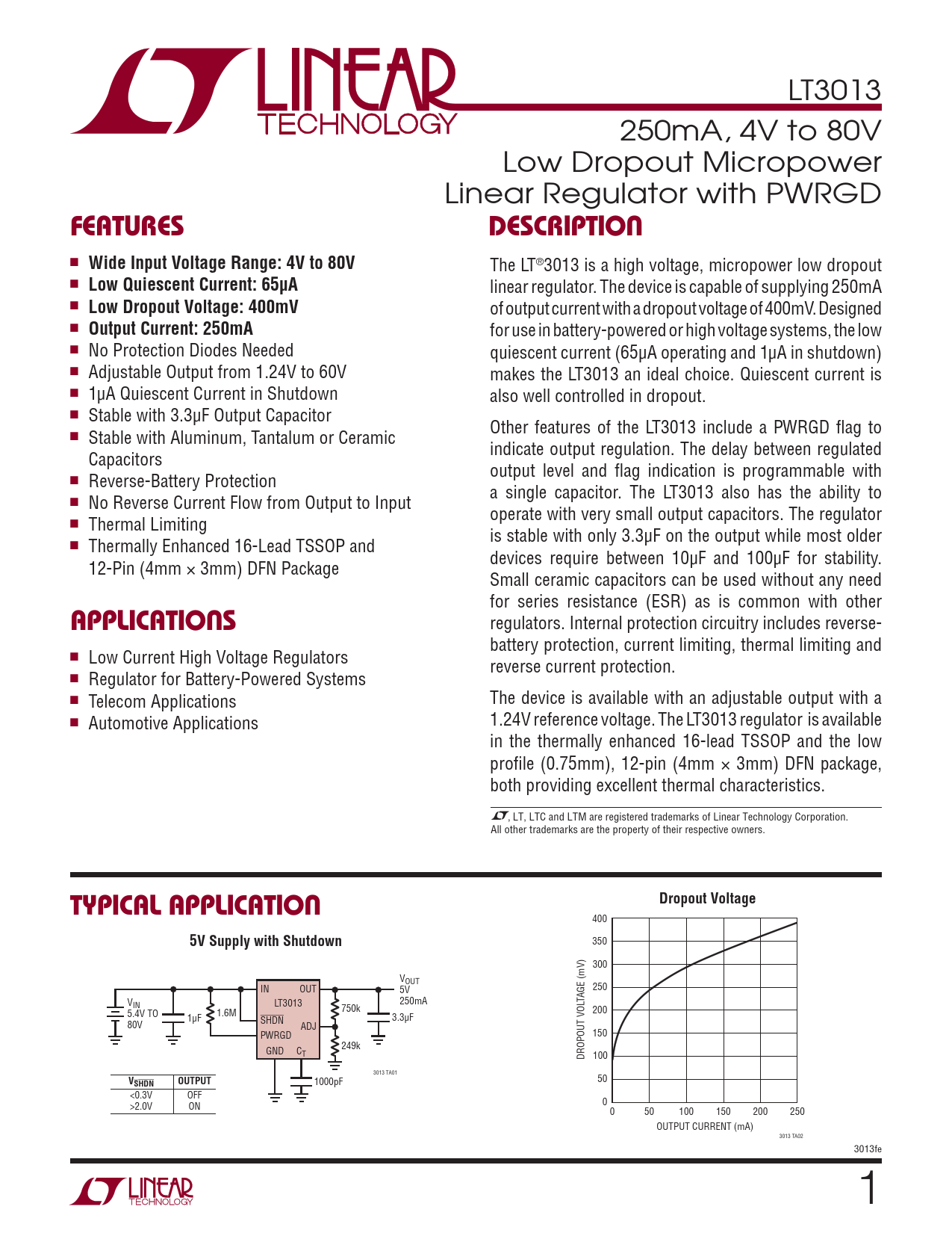 LT3013 250mA, 4V to 80V Low Dropout Micropower Linear Regulator with PWRGD FEATURESDESCRIPTION n Wide Input Voltage Range: 4V to 80V The LT®3013 is a high voltage, micropower low dropout n Low Quiescent Current: 65μA linear regulator. The device is capable of supplying 250mA n Low Dropout Voltage: 400mV of output current with a dropout voltage of 400mV. Designed n Output Current: 250mA for use in battery-powered or high voltage systems, the low n No Protection Diodes Needed quiescent current (65μA operating and 1μA in shutdown) n Adjustable Output from 1.24V to 60V makes the LT3013 an ideal choice. Quiescent current is n 1μA Quiescent Current in Shutdown also well controlled in dropout. n Stable with 3.3μF Output Capacitor Other features of the LT3013 include a PWRGD fl ag to n Stable with Aluminum, Tantalum or Ceramic indicate output regulation. The delay between regulated Capacitors output level and fl ag indication is programmable with n Reverse-Battery Protection a single capacitor. The LT3013 also has the ability to n No Reverse Current Flow from Output to Input operate with very small output capacitors. The regulator n Thermal Limiting is stable with only 3.3μF on the output while most older n Thermally Enhanced 16-Lead TSSOP and devices require between 10μF and 100μF for stability. 12-Pin (4mm × 3mm) DFN Package Small ceramic capacitors can be used without any need for series resistance (ESR) as is common with other APPLICATIONS regulators. Internal protection circuitry includes reverse- battery protection, current limiting, thermal limiting and n Low Current High Voltage Regulators reverse current protection. n Regulator for Battery-Powered Systems n Telecom Applications The device is available with an adjustable output with a n Automotive Applications 1.24V reference voltage. The LT3013 regulator is available in the thermally enhanced 16-lead TSSOP and the low profi le (0.75mm), 12-pin (4mm × 3mm) DFN package, both providing excellent thermal characteristics. , LT, LTC and LTM are registered trademarks of Linear Technology Corporation. All other trademarks are the property of their respective owners. TYPICAL APPLICATIONDropout Voltage 400 5V Supply with Shutdown 350 300 VOUT IN OUT 5V GE (mV) 250 V TA IN 250mA LT3013 750k 5.4V TO 200 1μF 1.6M 3.3μF SHDN 80V ADJ PWRGD 150 249k GND CT DROPOUT VOL 100 3013 TA01 VSHDNOUTPUT 1000pF 50 <0.3V OFF >2.0V ON 0 0 50 100 150 200 250 OUTPUT CURRENT (mA) 3013 TA02 3013fe 1