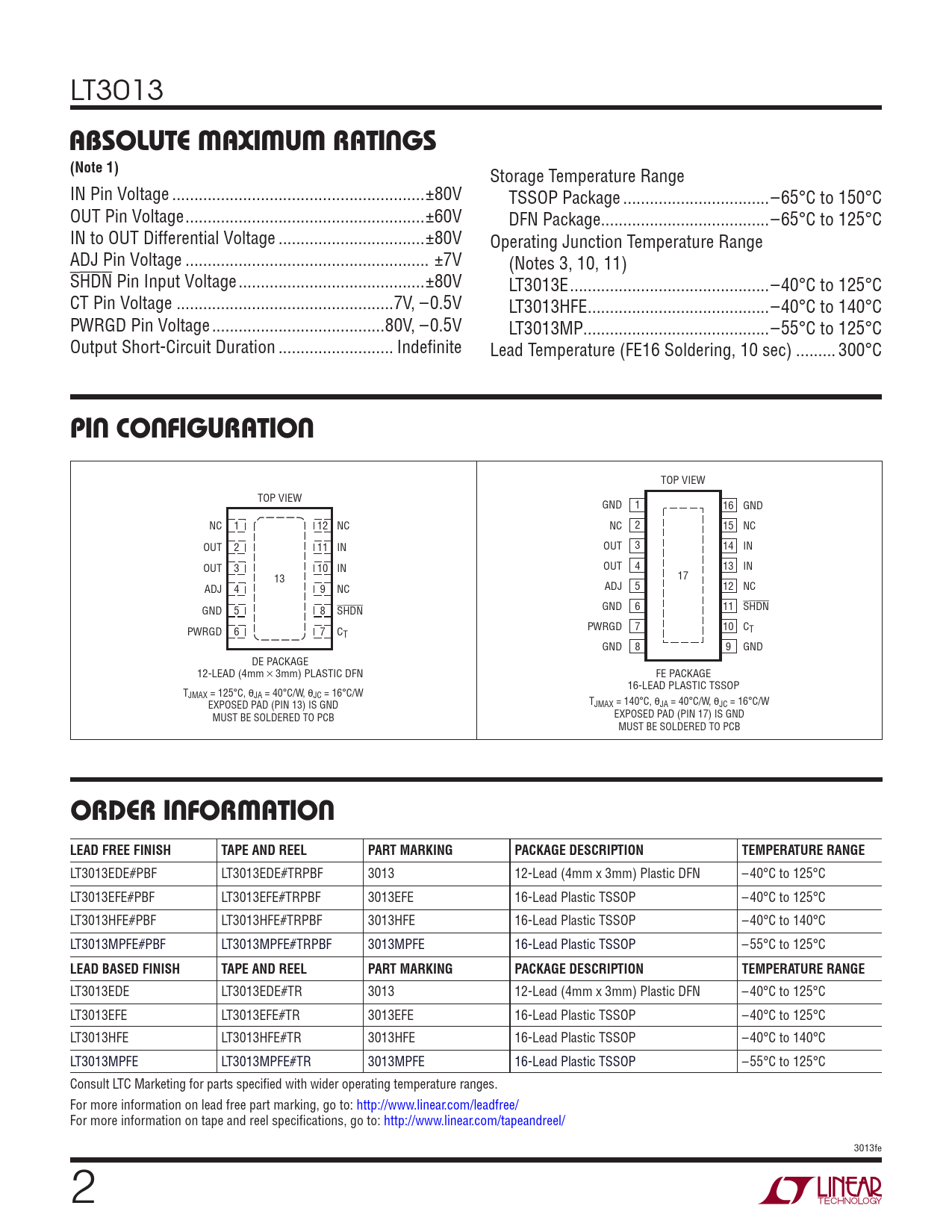 LT3013EDE LT3013EDE#TR 3013 12-Lead (4mm x 3mm) Plastic DFN –40°C to 125°C LT3013EFE LT3013EFE#TR 3013EFE 16-Lead Plastic TSSOP –40°C to 125°C LT3013HFE LT3013HFE#TR 3013HFE 16-Lead Plastic TSSOP –40°C to 140°C LT3013MPFE LT3013MPFE#TR 3013MPFE 16-Lead Plastic TSSOP –55°C to 125°C Consult LTC Marketing for parts specifi ed with wider operating temperature ranges. For more information on lead free part marking, go to: http://www.linear.com/leadfree/ For more information on tape and reel specifi cations, go to: http://www.linear.com/tapeandreel/ 3013fe 2