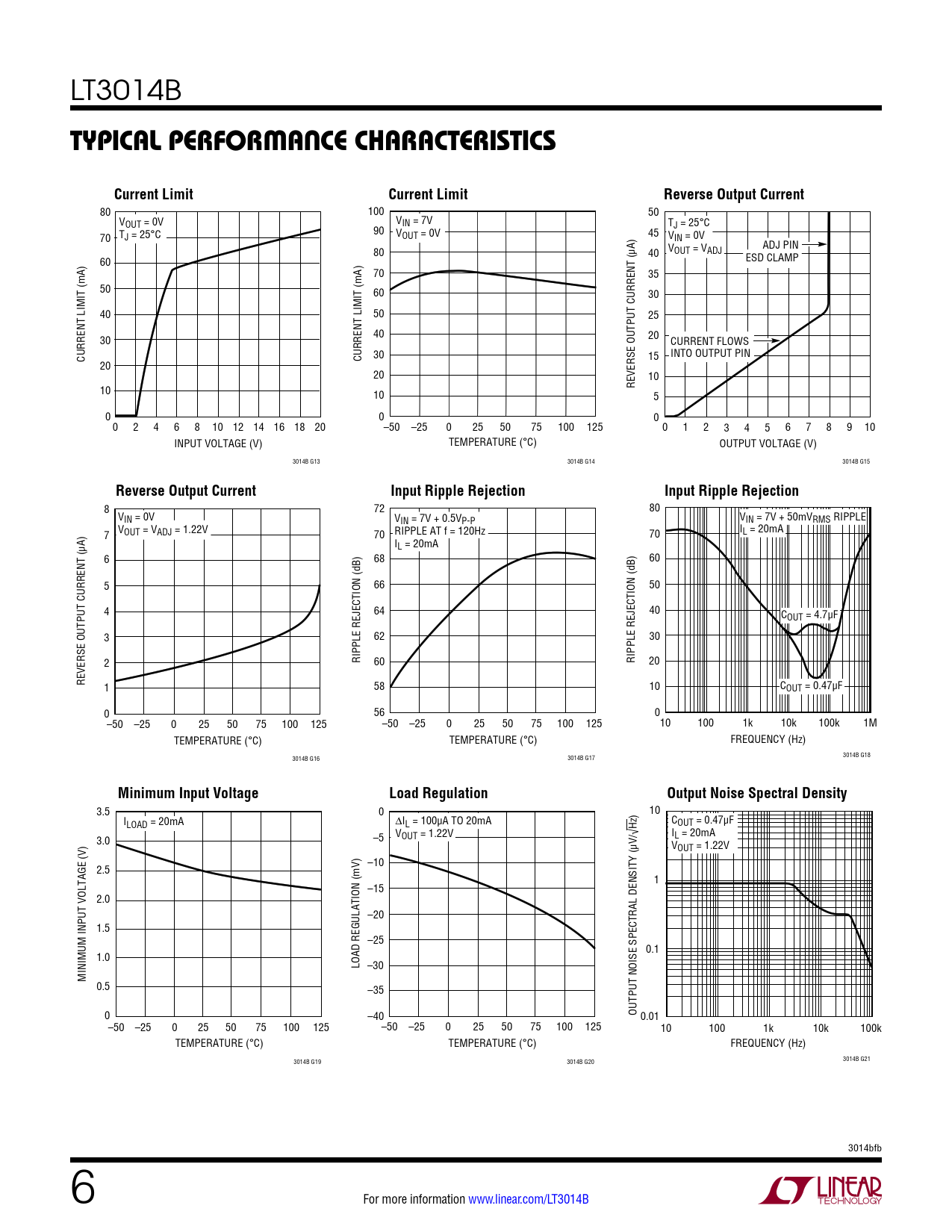 3.5 0 10 ILOAD = 20mA ∆IL = 100µA TO 20mA COUT = 0.47µF V I 3.0 –5 OUT = 1.22V L = 20mA VOUT = 1.22V –10 2.5 1 –15 2.0 –20 1.5 –25 0.1 1.0 LOAD REGULATION (mV) –30 MINIMUM INPUT VOLTAGE (V) 0.5 –35 0 –40 OUTPUT NOISE SPECTRAL DENSITY (µV/√Hz) 0.01 –50 –25 0 25 50 75 100 125 –50 –25 0 25 50 75 100 125 10 100 1k 10k 100k TEMPERATURE (°C) TEMPERATURE (°C) FREQUENCY (Hz) 3014B G19 3014B G20 3014B G21 3014bfb 6 For more information www.linear.com/LT3014B Document Outline Features Description Applications Typical Application Absolute Maximum Ratings Pin Configuration Electrical Characteristics Typical Performance Characteristics Pin Functions Applications Information