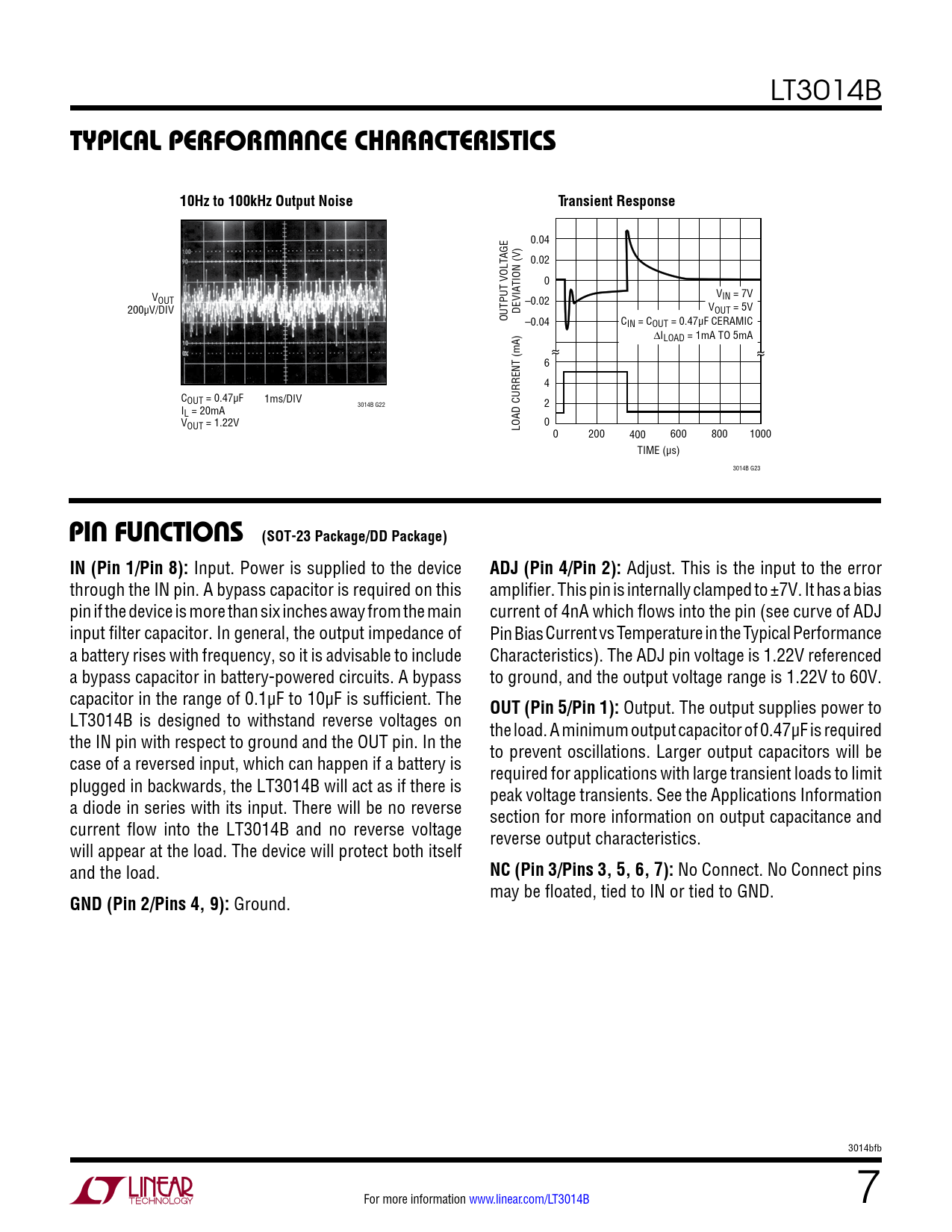 LT3014B TYPICAL PERFORMANCE CHARACTERISTICS10Hz to 100kHz Output NoiseTransient Response 0.04 0.02 0 V V OUT –0.02 IN = 7V 200µV/DIV DEVIATION (V) VOUT = 5V OUTPUT VOLTAGE –0.04 CIN = COUT = 0.47µF CERAMIC ∆ILOAD = 1mA TO 5mA 6 4 COUT = 0.47µF 1ms/DIV 3014B G22 2 IL = 20mA VOUT = 1.22V LOAD CURRENT (mA) 0 0 200 400 600 800 1000 TIME (µs) 3014B G23 PIN FUNCTIONS (SOT-23 Package/DD Package)IN (Pin 1/Pin 8): Input. Power is supplied to the device ADJ (Pin 4/Pin 2): Adjust. This is the input to the error through the IN pin. A bypass capacitor is required on this amplifier. This pin is internally clamped to ±7V. It has a bias pin if the device is more than six inches away from the main current of 4nA which flows into the pin (see curve of ADJ input filter capacitor. In general, the output impedance of Pin Bias Current vs Temperature in the Typical Performance a battery rises with frequency, so it is advisable to include Characteristics). The ADJ pin voltage is 1.22V referenced a bypass capacitor in battery-powered circuits. A bypass to ground, and the output voltage range is 1.22V to 60V. capacitor in the range of 0.1µF to 10µF is sufficient. The OUT (Pin 5/Pin 1): Output. The output supplies power to LT3014B is designed to withstand reverse voltages on the load. A minimum output capacitor of 0.47µF is required the IN pin with respect to ground and the OUT pin. In the to prevent oscillations. Larger output capacitors will be case of a reversed input, which can happen if a battery is required for applications with large transient loads to limit plugged in backwards, the LT3014B will act as if there is peak voltage transients. See the Applications Information a diode in series with its input. There will be no reverse section for more information on output capacitance and current flow into the LT3014B and no reverse voltage reverse output characteristics. will appear at the load. The device will protect both itself and the load. NC (Pin 3/Pins 3, 5, 6, 7): No Connect. No Connect pins may be floated, tied to IN or tied to GND. GND (Pin 2/Pins 4, 9): Ground. 3014bfb For more information www.linear.com/LT3014B 7 Document Outline Features Description Applications Typical Application Absolute Maximum Ratings Pin Configuration Electrical Characteristics Typical Performance Characteristics Pin Functions Applications Information